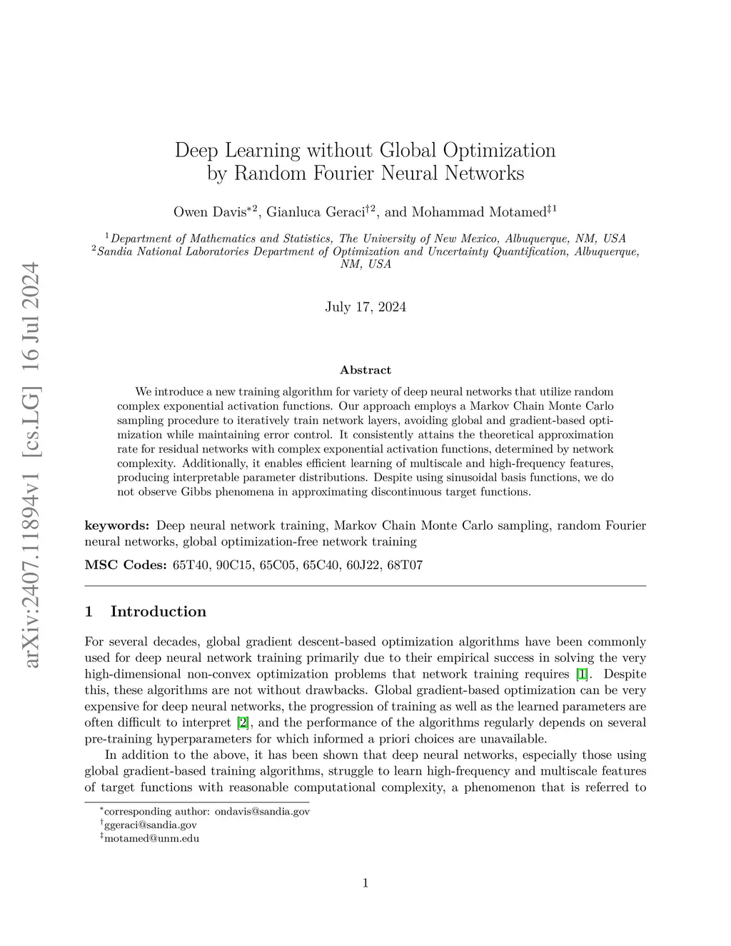 We introduce a new training algorithm for deep neural networks that utilize random complex exponential activation functions. Our approach employs a Markov Chain Monte Carlo sampling procedure to iteratively train network layers, avoiding global and gradient-based optimization while maintaining error control. It consistently attains the theoretical approximation rate for residual networks with complex exponential activation functions, determined by network complexity. Additionally, it enables efficient learning of multiscale and high-frequency features, producing interpretable parameter distributions. Despite using sinusoidal basis functions, we do not observe Gibbs phenomena in approximating discontinuous target functions.