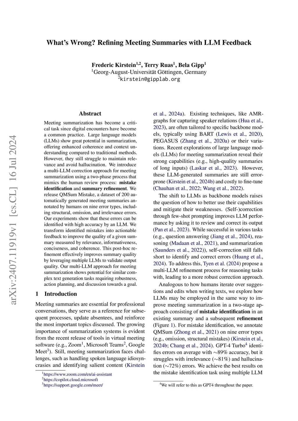 Meeting summarization has become a critical task since digital encounters have become a common practice. Large language models (LLMs) show great potential in summarization, offering enhanced coherence and context understanding compared to traditional methods. However, they still struggle to maintain relevance and avoid hallucination. We introduce a multi-LLM correction approach for meeting summarization using a two-phase process that mimics the human review process: mistake identification and summary refinement. We release QMSum Mistake, a dataset of 200 automatically generated meeting summaries annotated by humans on nine error types, including structural, omission, and irrelevance errors. Our experiments show that these errors can be identified with high accuracy by an LLM. We transform identified mistakes into actionable feedback to improve the quality of a given summary measured by relevance, informativeness, conciseness, and coherence. This post-hoc refinement effectively improves summary quality by leveraging multiple LLMs to validate output quality. Our multi-LLM approach for meeting summarization shows potential for similar complex text generation tasks requiring robustness, action planning, and discussion towards a goal.