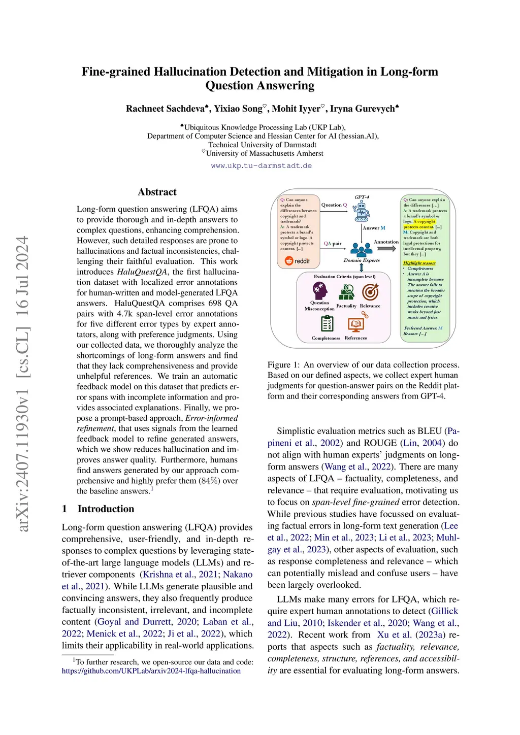 Long-form question answering (LFQA) aims to provide thorough and in-depth answers to complex questions, enhancing comprehension. However, such detailed responses are prone to hallucinations and factual inconsistencies, challenging their faithful evaluation. This work introduces HaluQuestQA, the first hallucination dataset with localized error annotations for human-written and model-generated LFQA answers. HaluQuestQA comprises 698 QA pairs with 1.8k span-level error annotations for five different error types by expert annotators, along with preference judgments. Using our collected data, we thoroughly analyze the shortcomings of long-form answers and find that they lack comprehensiveness and provide unhelpful references. We train an automatic feedback model on this dataset that predicts error spans with incomplete information and provides associated explanations. Finally, we propose a prompt-based approach, Error-informed refinement, that uses signals from the learned feedback model to refine generated answers, which we show reduces errors and improves answer quality across multiple models. Furthermore, humans find answers generated by our approach comprehensive and highly prefer them (84%) over the baseline answers.