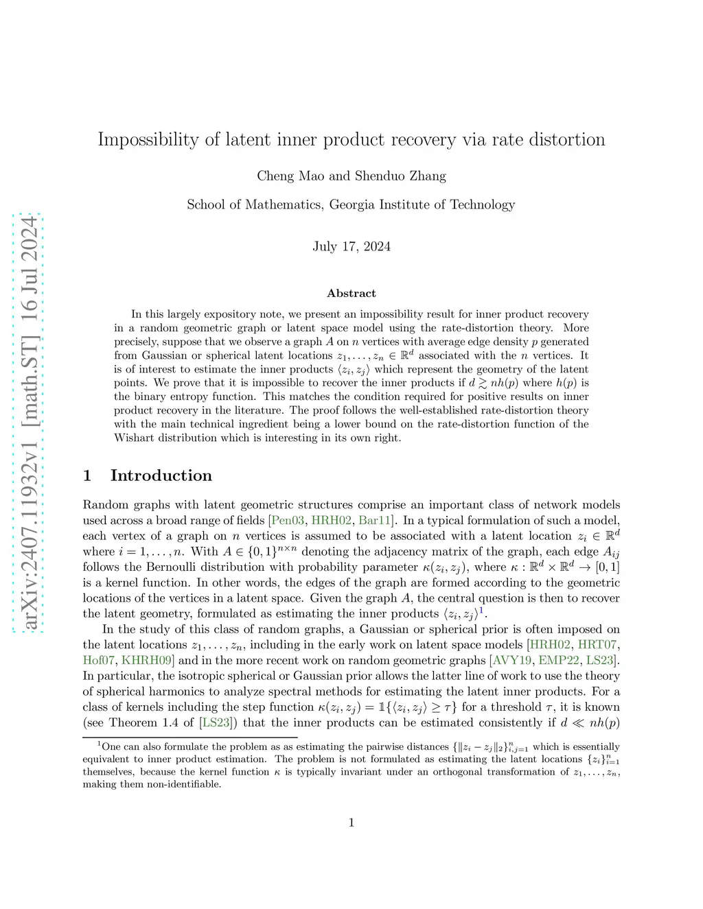 In this largely expository note, we present an impossibility result for inner product recovery in a random geometric graph or latent space model using the rate-distortion theory. More precisely, suppose that we observe a graph on vertices with average edge density generated from Gaussian or spherical latent locations associated with the vertices. It is of interest to estimate the inner products which represent the geometry of the latent points. We prove that it is impossible to recover the inner products if where is the binary entropy function. This matches the condition required for positive results on inner product recovery in the literature. The proof follows the well-established rate-distortion theory with the main technical ingredient being a lower bound on the rate-distortion function of the Wishart distribution which is interesting in its own right.