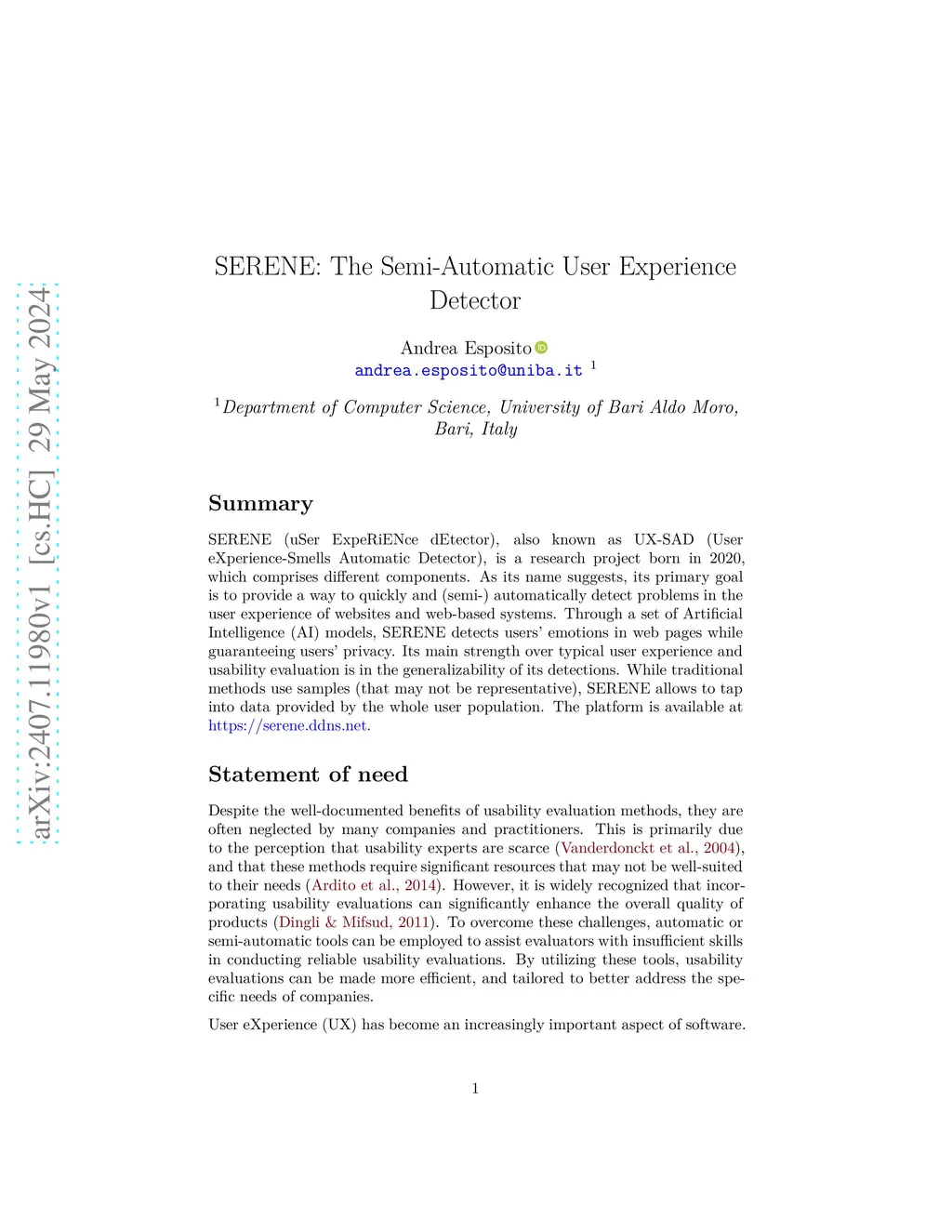 SERENE (uSer ExpeRiENce dEtector), also known as UX-SAD (User eXperience-Smells Automatic Detector), is a research project born in 2020, which comprises different components. As its name suggests, its primary goal is to provide a way to quickly and (semi-) automatically detect problems in the user experience of websites and web-based systems. Through a set of Artificial Intelligence (AI) models, SERENE detects users' emotions in web pages while guaranteeing users' privacy. Its main strength over typical user experience and usability evaluation is in the generalizability of its detections. While traditional methods use samples (that may not be representative), SERENE allows to tap into data provided by the whole user population. The platform is available at https://serene.ddns.net.