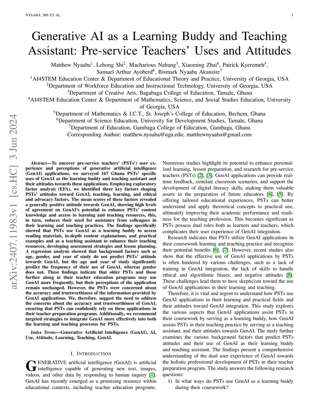 To uncover pre-service teachers' (PSTs') user experience and perceptions of generative artificial intelligence (GenAI) applications, we surveyed 167 Ghana PSTs' specific uses of GenAI as a learning buddy and teaching assistant, and their attitudes towards these applications. Employing exploratory factor analysis (EFA), we identified three key factors shaping PSTs' attitudes towards GenAI: teaching, learning, and ethical and advocacy factors. The mean scores of these factors revealed a generally positive attitude towards GenAI, indicating high levels of agreement on its potential to enhance PSTs' content knowledge and access to learning and teaching resources, thereby reducing their need for assistance from colleagues. Specifically, PSTs use GenAI as a learning buddy to access reading materials, in-depth content explanations, and practical examples, and as a teaching assistant to enhance teaching resources, develop assessment strategies, and plan lessons. A regression analysis showed that background factors such as age, gender, and year of study do not predict PSTs' attitudes towards GenAI, but age and year of study significantly predict the frequency of their use of GenAI, while gender does not. These findings suggest that older PSTs and those further along in their teacher education programs may use GenAI more frequently, but their perceptions of the application remain unchanged. However, PSTs expressed concerns about the accuracy and trustworthiness of the information provided by GenAI applications. We, therefore, suggest addressing these concerns to ensure PSTs can confidently rely on these applications in their teacher preparation programs. Additionally, we recommend targeted strategies to integrate GenAI more effectively into both learning and teaching processes for PSTs.