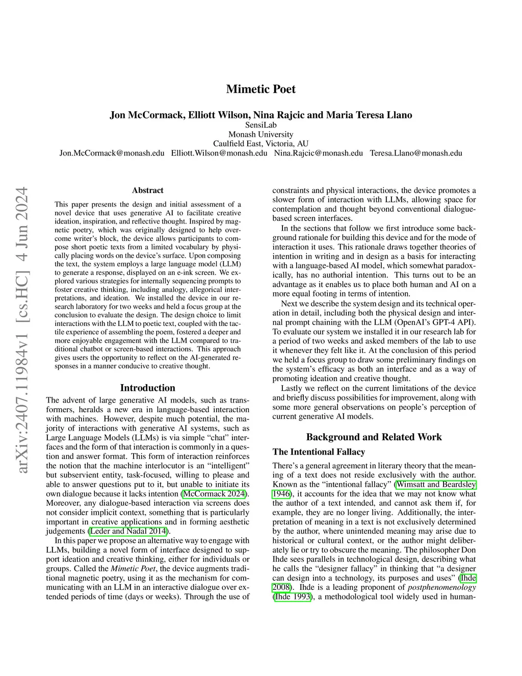 This paper presents the design and initial assessment of a novel device that uses generative AI to facilitate creative ideation, inspiration, and reflective thought. Inspired by magnetic poetry, which was originally designed to help overcome writer's block, the device allows participants to compose short poetic texts from a limited vocabulary by physically placing words on the device's surface. Upon composing the text, the system employs a large language model (LLM) to generate a response, displayed on an e-ink screen. We explored various strategies for internally sequencing prompts to foster creative thinking, including analogy, allegorical interpretations, and ideation. We installed the device in our research laboratory for two weeks and held a focus group at the conclusion to evaluate the design. The design choice to limit interactions with the LLM to poetic text, coupled with the tactile experience of assembling the poem, fostered a deeper and more enjoyable engagement with the LLM compared to traditional chatbot or screen-based interactions. This approach gives users the opportunity to reflect on the AI-generated responses in a manner conducive to creative thought.