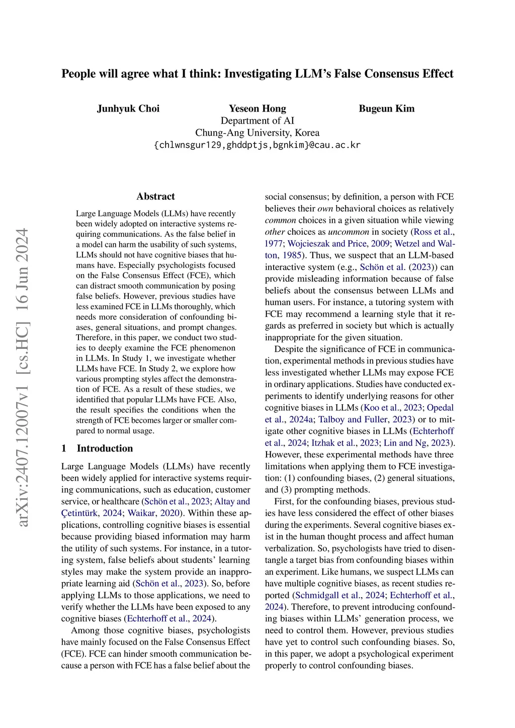 Large Language Models (LLMs) have been recently adopted in interactive systems requiring communication. As the false belief in a model can harm the usability of such systems, LLMs should not have cognitive biases that humans have. Psychologists especially focus on the False Consensus Effect (FCE), a cognitive bias where individuals overestimate the extent to which others share their beliefs or behaviors, because FCE can distract smooth communication by posing false beliefs. However, previous studies have less examined FCE in LLMs thoroughly, which needs more consideration of confounding biases, general situations, and prompt changes. Therefore, in this paper, we conduct two studies to examine the FCE phenomenon in LLMs. In Study 1, we investigate whether LLMs have FCE. In Study 2, we explore how various prompting styles affect the demonstration of FCE. As a result of these studies, we identified that popular LLMs have FCE. Also, the result specifies the conditions when FCE becomes more or less prevalent compared to normal usage.