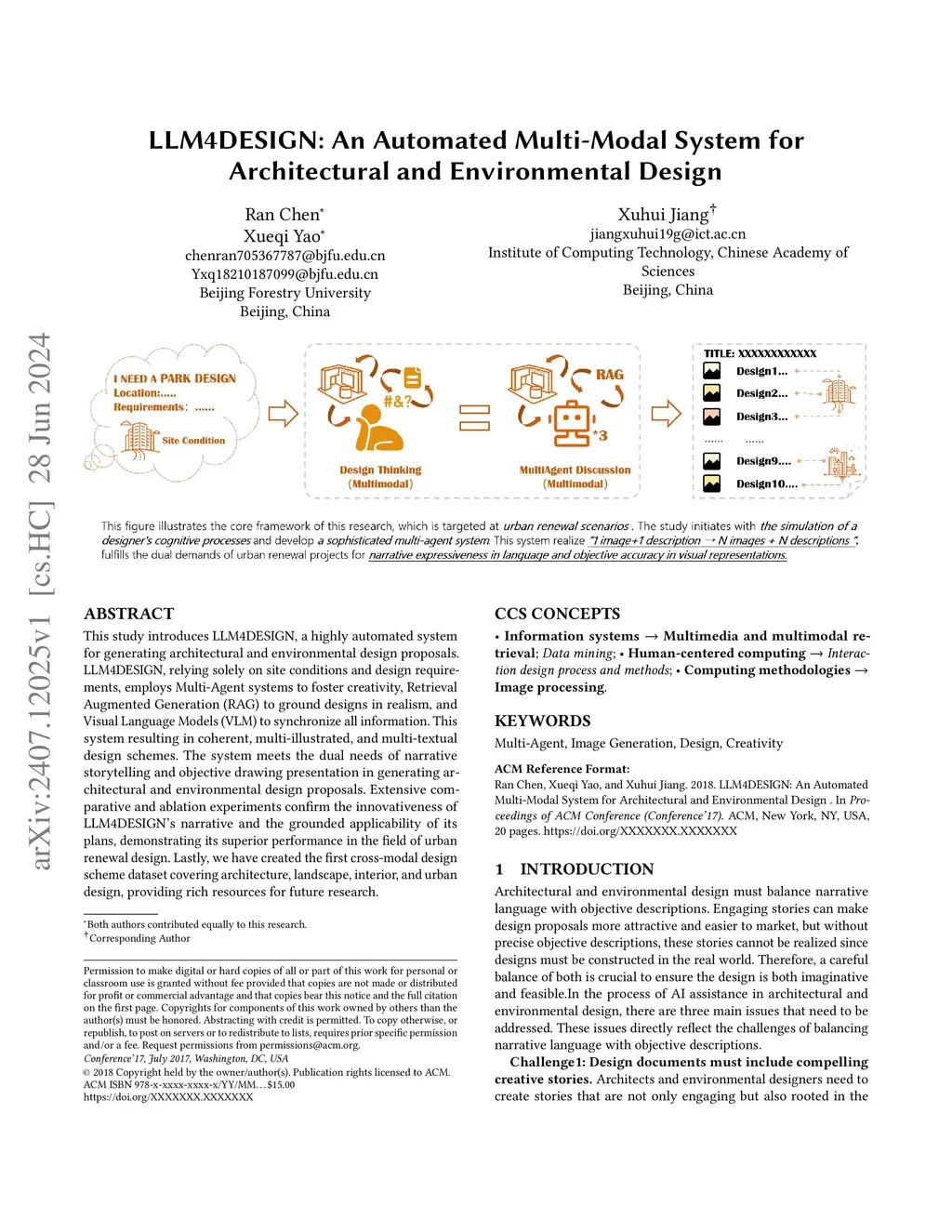 This study introduces LLM4DESIGN, a highly automated system for generating architectural and environmental design proposals. LLM4DESIGN, relying solely on site conditions and design requirements, employs Multi-Agent systems to foster creativity, Retrieval Augmented Generation (RAG) to ground designs in realism, and Visual Language Models (VLM) to synchronize all information. This system resulting in coherent, multi-illustrated, and multi-textual design schemes. The system meets the dual needs of narrative storytelling and objective drawing presentation in generating architectural and environmental design proposals. Extensive comparative and ablation experiments confirm the innovativeness of LLM4DESIGN's narrative and the grounded applicability of its plans, demonstrating its superior performance in the field of urban renewal design. Lastly, we have created the first cross-modal design scheme dataset covering architecture, landscape, interior, and urban design, providing rich resources for future research.