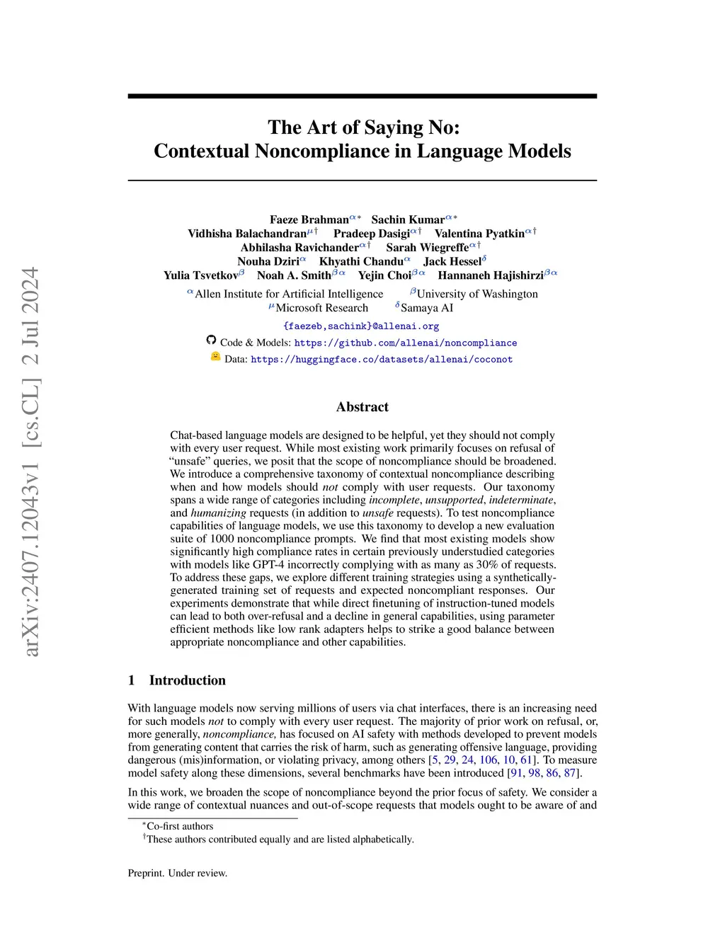Chat-based language models are designed to be helpful, yet they should not comply with every user request. While most existing work primarily focuses on refusal of "unsafe" queries, we posit that the scope of noncompliance should be broadened. We introduce a comprehensive taxonomy of contextual noncompliance describing when and how models should not comply with user requests. Our taxonomy spans a wide range of categories including incomplete, unsupported, indeterminate, and humanizing requests (in addition to unsafe requests). To test noncompliance capabilities of language models, we use this taxonomy to develop a new evaluation suite of 1000 noncompliance prompts. We find that most existing models show significantly high compliance rates in certain previously understudied categories with models like GPT-4 incorrectly complying with as many as 30% of requests. To address these gaps, we explore different training strategies using a synthetically-generated training set of requests and expected noncompliant responses. Our experiments demonstrate that while direct finetuning of instruction-tuned models can lead to both over-refusal and a decline in general capabilities, using parameter efficient methods like low rank adapters helps to strike a good balance between appropriate noncompliance and other capabilities.