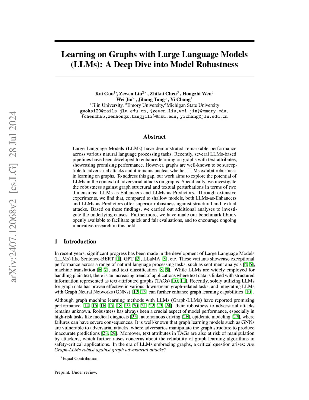 Large Language Models (LLMs) have demonstrated remarkable performance across various natural language processing tasks. Recently, several LLMs-based pipelines have been developed to enhance learning on graphs with text attributes, showcasing promising performance. However, graphs are well-known to be susceptible to adversarial attacks and it remains unclear whether LLMs exhibit robustness in learning on graphs. To address this gap, our work aims to explore the potential of LLMs in the context of adversarial attacks on graphs. Specifically, we investigate the robustness against graph structural and textual perturbations in terms of two dimensions: LLMs-as-Enhancers and LLMs-as-Predictors. Through extensive experiments, we find that, compared to shallow models, both LLMs-as-Enhancers and LLMs-as-Predictors offer superior robustness against structural and textual attacks.Based on these findings, we carried out additional analyses to investigate the underlying causes. Furthermore, we have made our benchmark library openly available to facilitate quick and fair evaluations, and to encourage ongoing innovative research in this field.