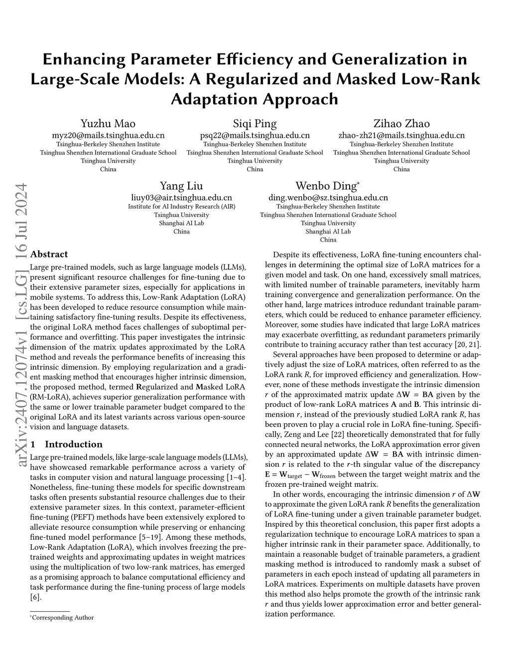 Large pre-trained models, such as large language models (LLMs), present significant resource challenges for fine-tuning due to their extensive parameter sizes, especially for applications in mobile systems. To address this, Low-Rank Adaptation (LoRA) has been developed to reduce resource consumption while maintaining satisfactory fine-tuning results. Despite its effectiveness, the original LoRA method faces challenges of suboptimal performance and overfitting. This paper investigates the intrinsic dimension of the matrix updates approximated by the LoRA method and reveals the performance benefits of increasing this intrinsic dimension. By employing regularization and a gradient masking method that encourages higher intrinsic dimension, the proposed method, termed Regularized and Masked LoRA (RM-LoRA), achieves superior generalization performance with the same or lower trainable parameter budget compared to the original LoRA and its latest variants across various open-source vision and language datasets.