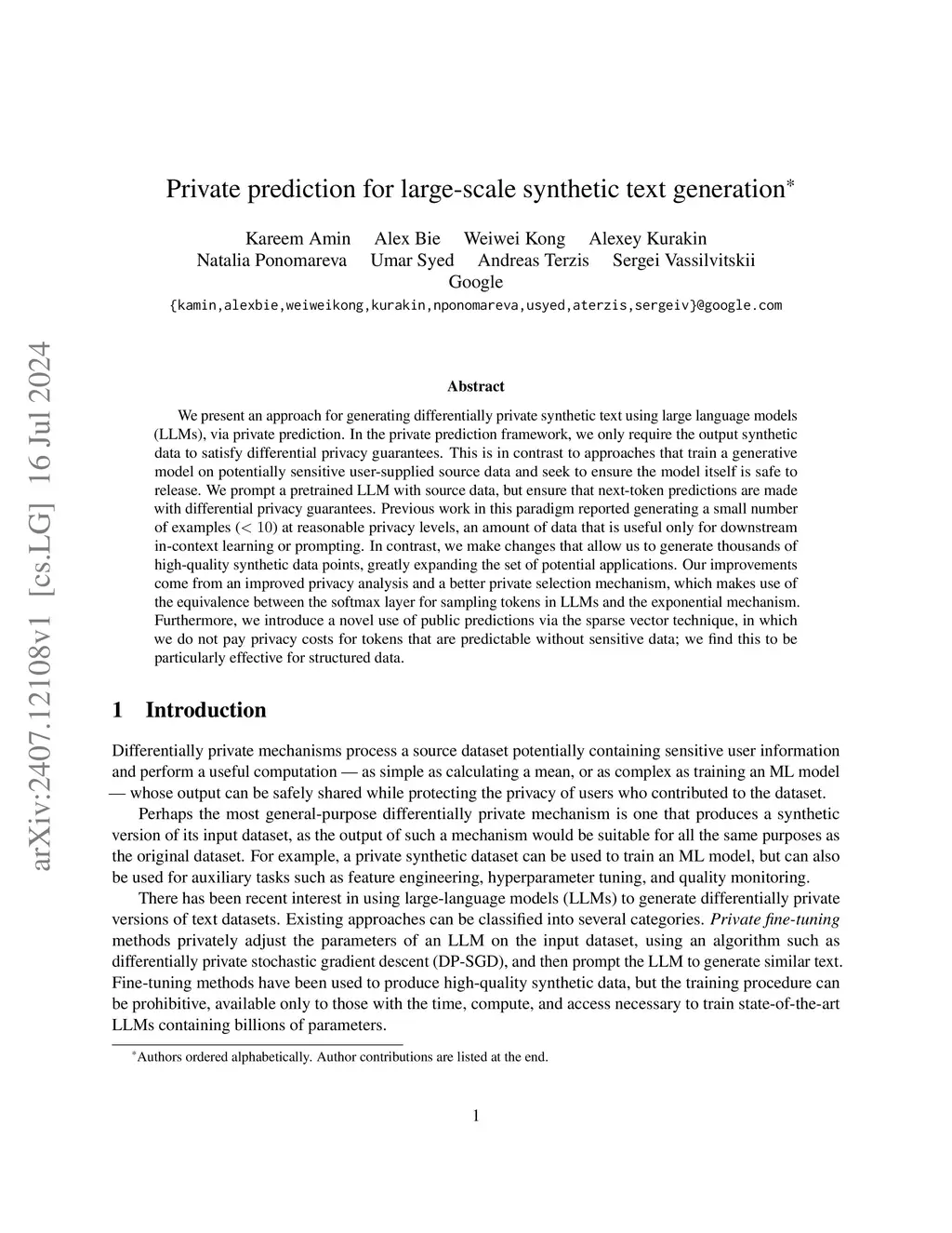 Private prediction for large-scale synthetic text generation