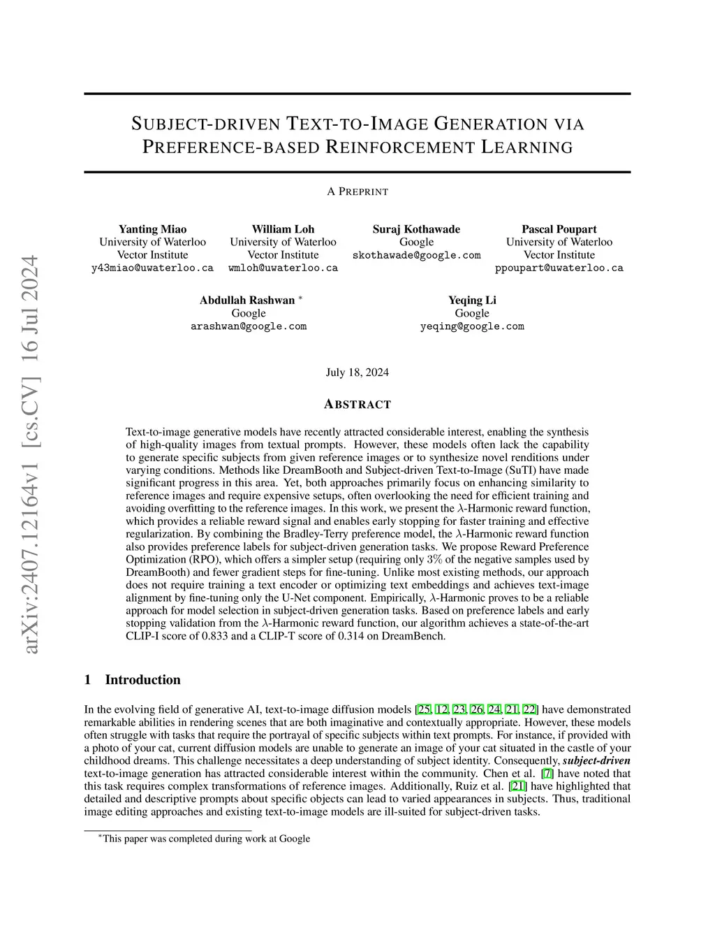 Text-to-image generative models have recently attracted considerable interest, enabling the synthesis of high-quality images from textual prompts. However, these models often lack the capability to generate specific subjects from given reference images or to synthesize novel renditions under varying conditions. Methods like DreamBooth and Subject-driven Text-to-Image (SuTI) have made significant progress in this area. Yet, both approaches primarily focus on enhancing similarity to reference images and require expensive setups, often overlooking the need for efficient training and avoiding overfitting to the reference images. In this work, we present the -Harmonic reward function, which provides a reliable reward signal and enables early stopping for faster training and effective regularization. By combining the Bradley-Terry preference model, the -Harmonic reward function also provides preference labels for subject-driven generation tasks. We propose Reward Preference Optimization (RPO), which offers a simpler setup (requiring only of the negative samples used by DreamBooth) and fewer gradient steps for fine-tuning. Unlike most existing methods, our approach does not require training a text encoder or optimizing text embeddings and achieves text-image alignment by fine-tuning only the U-Net component. Empirically, -Harmonic proves to be a reliable approach for model selection in subject-driven generation tasks. Based on preference labels and early stopping validation from the -Harmonic reward function, our algorithm achieves a state-of-the-art CLIP-I score of 0.833 and a CLIP-T score of 0.314 on DreamBench.