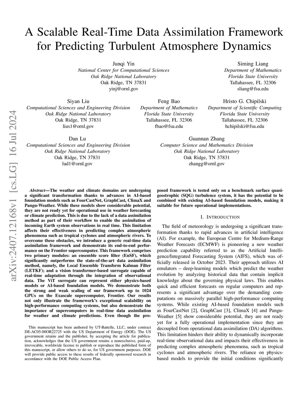 The weather and climate domains are undergoing a significant transformation thanks to advances in AI-based foundation models such as FourCastNet, GraphCast, ClimaX and Pangu-Weather. While these models show considerable potential, they are not ready yet for operational use in weather forecasting or climate prediction. This is due to the lack of a data assimilation method as part of their workflow to enable the assimilation of incoming Earth system observations in real time. This limitation affects their effectiveness in predicting complex atmospheric phenomena such as tropical cyclones and atmospheric rivers. To overcome these obstacles, we introduce a generic real-time data assimilation framework and demonstrate its end-to-end performance on the Frontier supercomputer. This framework comprises two primary modules: an ensemble score filter (EnSF), which significantly outperforms the state-of-the-art data assimilation method, namely, the Local Ensemble Transform Kalman Filter (LETKF); and a vision transformer-based surrogate capable of real-time adaptation through the integration of observational data. The ViT surrogate can represent either physics-based models or AI-based foundation models. We demonstrate both the strong and weak scaling of our framework up to 1024 GPUs on the Exascale supercomputer, Frontier. Our results not only illustrate the framework's exceptional scalability on high-performance computing systems, but also demonstrate the importance of supercomputers in real-time data assimilation for weather and climate predictions. Even though the proposed framework is tested only on a benchmark surface quasi-geostrophic (SQG) turbulence system, it has the potential to be combined with existing AI-based foundation models, making it suitable for future operational implementations.