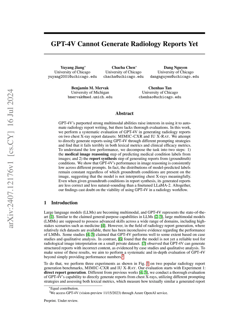 GPT-4V's purported strong multimodal abilities raise interests in using it to automate radiology report writing, but there lacks thorough evaluations. In this work, we perform a systematic evaluation of GPT-4V in generating radiology reports on two chest X-ray report datasets: MIMIC-CXR and IU X-Ray. We attempt to directly generate reports using GPT-4V through different prompting strategies and find that it fails terribly in both lexical metrics and clinical efficacy metrics. To understand the low performance, we decompose the task into two steps: 1) the medical image reasoning step of predicting medical condition labels from images; and 2) the report synthesis step of generating reports from (groundtruth) conditions. We show that GPT-4V's performance in image reasoning is consistently low across different prompts. In fact, the distributions of model-predicted labels remain constant regardless of which groundtruth conditions are present on the image, suggesting that the model is not interpreting chest X-rays meaningfully. Even when given groundtruth conditions in report synthesis, its generated reports are less correct and less natural-sounding than a finetuned LLaMA-2. Altogether, our findings cast doubt on the viability of using GPT-4V in a radiology workflow.