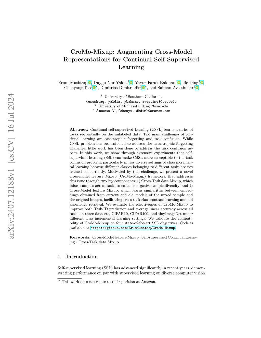 Continual self-supervised learning (CSSL) learns a series of tasks sequentially on the unlabeled data. Two main challenges of continual learning are catastrophic forgetting and task confusion. While CSSL problem has been studied to address the catastrophic forgetting challenge, little work has been done to address the task confusion aspect. In this work, we show through extensive experiments that self-supervised learning (SSL) can make CSSL more susceptible to the task confusion problem, particularly in less diverse settings of class incremental learning because different classes belonging to different tasks are not trained concurrently. Motivated by this challenge, we present a novel cross-model feature Mixup (CroMo-Mixup) framework that addresses this issue through two key components: 1) Cross-Task data Mixup, which mixes samples across tasks to enhance negative sample diversity; and 2) Cross-Model feature Mixup, which learns similarities between embeddings obtained from current and old models of the mixed sample and the original images, facilitating cross-task class contrast learning and old knowledge retrieval. We evaluate the effectiveness of CroMo-Mixup to improve both Task-ID prediction and average linear accuracy across all tasks on three datasets, CIFAR10, CIFAR100, and tinyImageNet under different class-incremental learning settings. We validate the compatibility of CroMo-Mixup on four state-of-the-art SSL objectives. Code is available at \url{https://github.com/ErumMushtaq/CroMo-Mixup}.