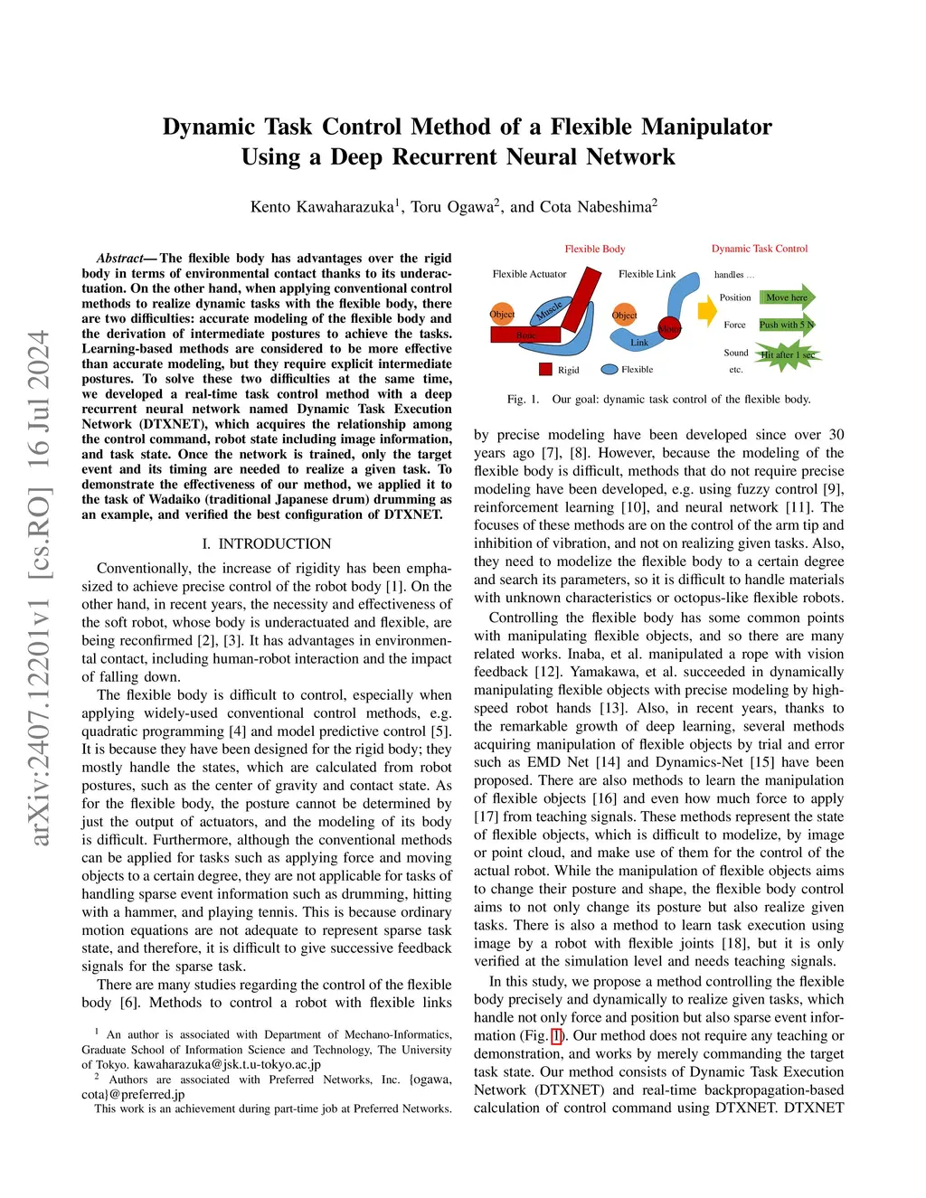 The flexible body has advantages over the rigid body in terms of environmental contact thanks to its underactuation. On the other hand, when applying conventional control methods to realize dynamic tasks with the flexible body, there are two difficulties: accurate modeling of the flexible body and the derivation of intermediate postures to achieve the tasks. Learning-based methods are considered to be more effective than accurate modeling, but they require explicit intermediate postures. To solve these two difficulties at the same time, we developed a real-time task control method with a deep recurrent neural network named Dynamic Task Execution Network (DTXNET), which acquires the relationship among the control command, robot state including image information, and task state. Once the network is trained, only the target event and its timing are needed to realize a given task. To demonstrate the effectiveness of our method, we applied it to the task of Wadaiko (traditional Japanese drum) drumming as an example, and verified the best configuration of DTXNET.