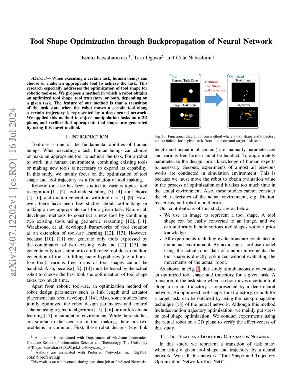 When executing a certain task, human beings can choose or make an appropriate tool to achieve the task. This research especially addresses the optimization of tool shape for robotic tool-use. We propose a method in which a robot obtains an optimized tool shape, tool trajectory, or both, depending on a given task. The feature of our method is that a transition of the task state when the robot moves a certain tool along a certain trajectory is represented by a deep neural network. We applied this method to object manipulation tasks on a 2D plane, and verified that appropriate tool shapes are generated by using this novel method.