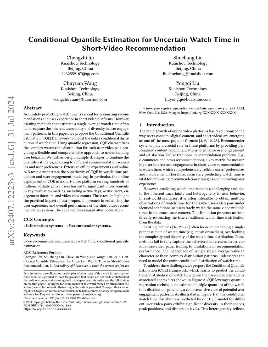 Accurately predicting watch time is crucial for optimizing recommendations and user experience in short video platforms. However, existing methods that estimate a single average watch time often fail to capture the inherent uncertainty in user engagement patterns. In this paper, we propose Conditional Quantile Estimation (CQE) to model the entire conditional distribution of watch time. Using quantile regression, CQE characterizes the complex watch-time distribution for each user-video pair, providing a flexible and comprehensive approach to understanding user behavior. We further design multiple strategies to combine the quantile estimates, adapting to different recommendation scenarios and user preferences. Extensive offline experiments and online A/B tests demonstrate the superiority of CQE in watch-time prediction and user engagement modeling. Specifically, deploying CQE online on a large-scale platform with hundreds of millions of daily active users has led to substantial gains in key evaluation metrics, including active days, engagement time, and video views. These results highlight the practical impact of our proposed approach in enhancing the user experience and overall performance of the short video recommendation system. The code will be releasedthis https URL.
