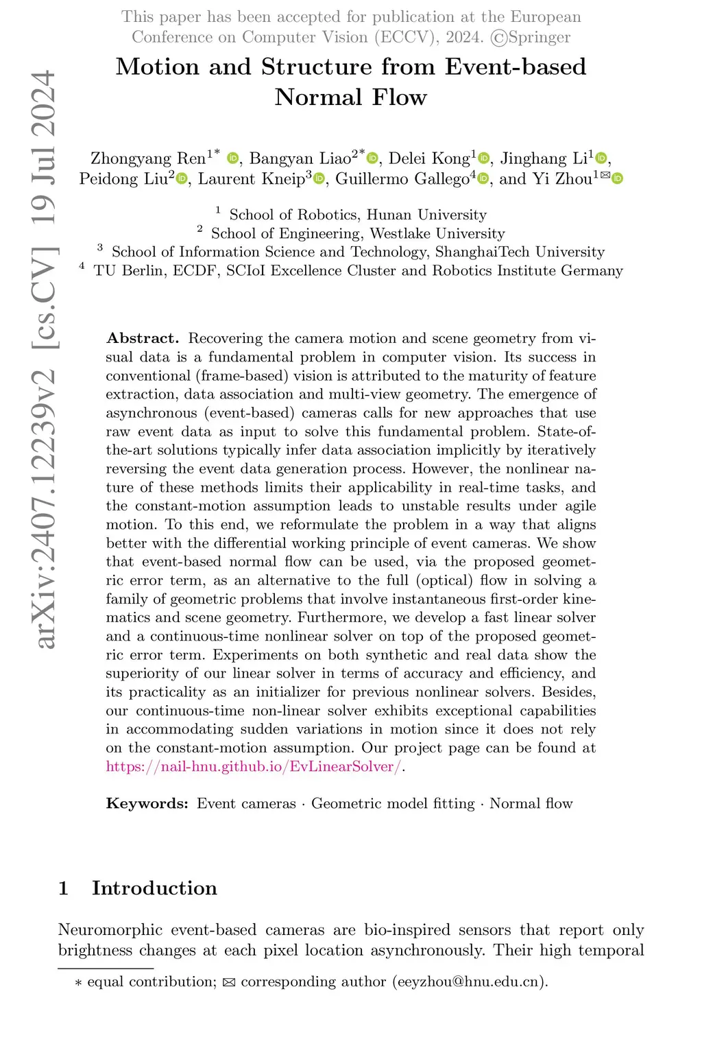 Recovering the camera motion and scene geometry from visual data is a fundamental problem in the field of computer vision. Its success in standard vision is attributed to the maturity of feature extraction, data association and multi-view geometry. The recent emergence of neuromorphic event-based cameras places great demands on approaches that use raw event data as input to solve this fundamental problem.Existing state-of-the-art solutions typically infer implicitly data association by iteratively reversing the event data generation process. However, the nonlinear nature of these methods limits their applicability in real-time tasks, and the constant-motion assumption leads to unstable results under agile motion. To this end, we rethink the problem formulation in a way that aligns better with the differential working principle of event cameras.We show that the event-based normal flow can be used, via the proposed geometric error term, as an alternative to the full flow in solving a family of geometric problems that involve instantaneous first-order kinematics and scene geometry. Furthermore, we develop a fast linear solver and a continuous-time nonlinear solver on top of the proposed geometric error term.Experiments on both synthetic and real data show the superiority of our linear solver in terms of accuracy and efficiency, and indicate its complementary feature as an initialization method for existing nonlinear solvers. Besides, our continuous-time non-linear solver exhibits exceptional capability in accommodating sudden variations in motion since it does not rely on the constant-motion assumption.