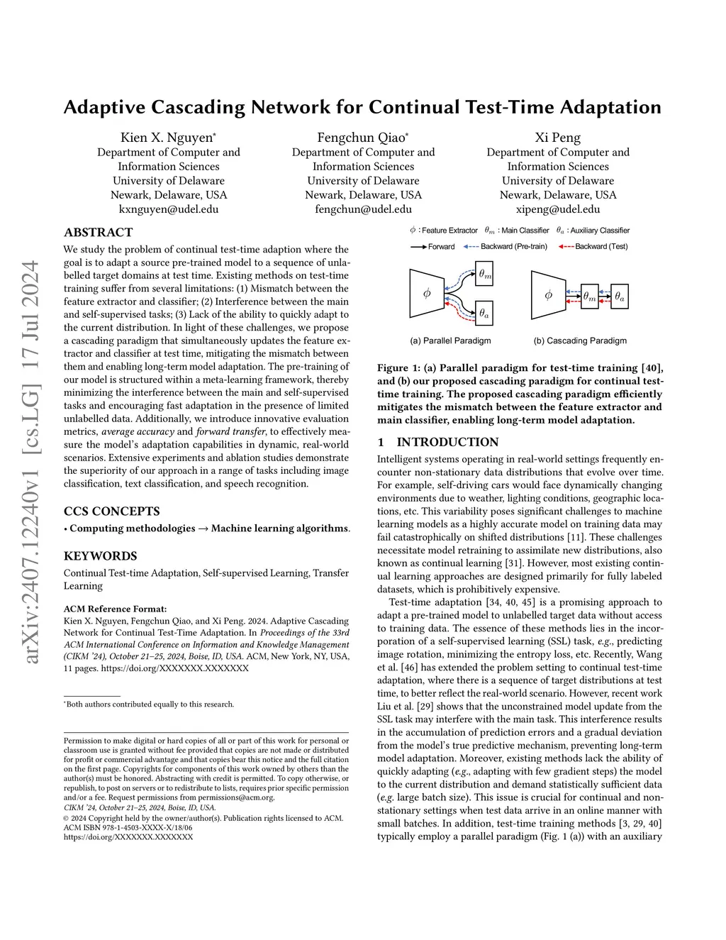 Adaptive Cascading Network for Continual Test-Time Adaptation