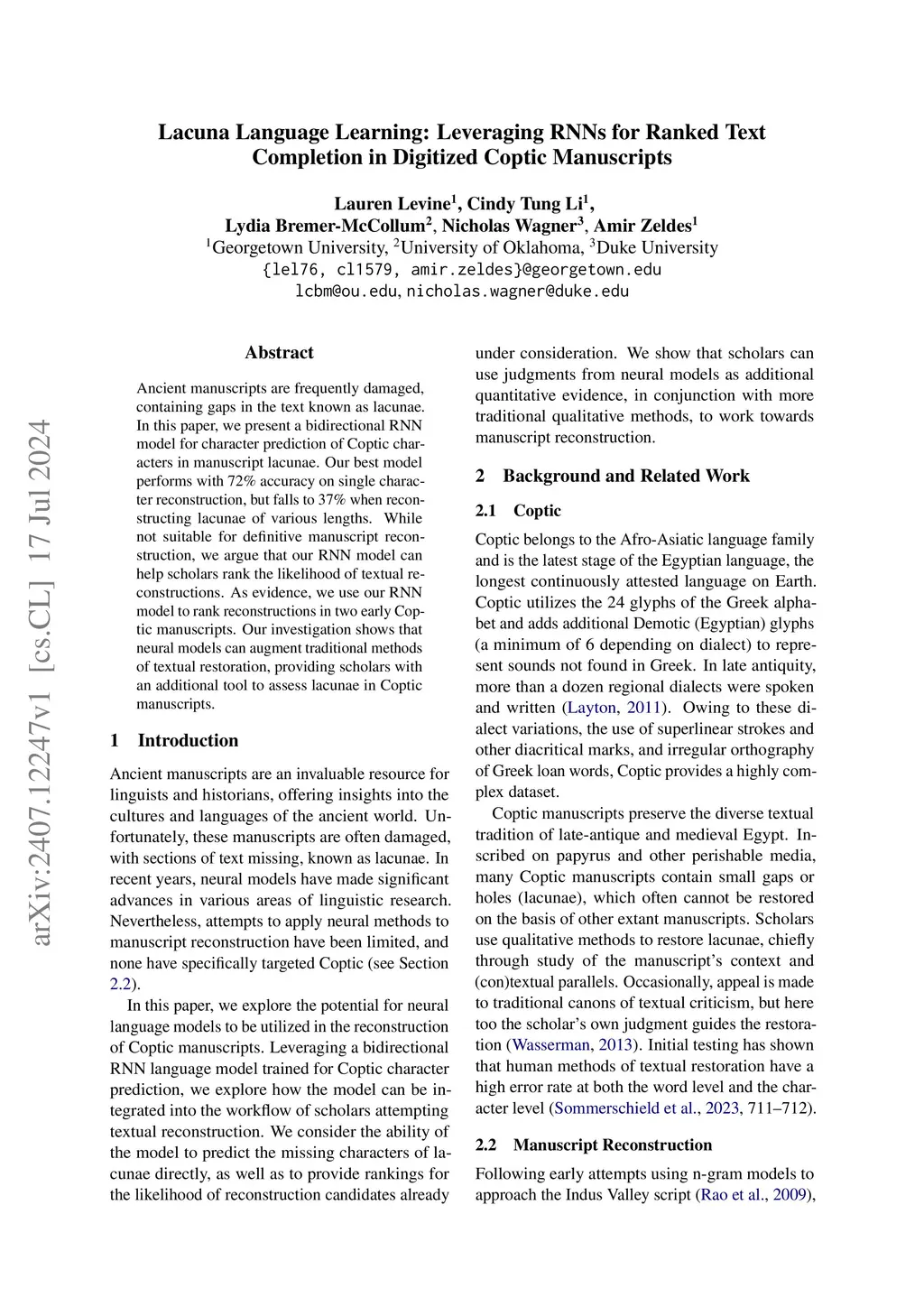 Ancient manuscripts are frequently damaged, containing gaps in the text known as lacunae. In this paper, we present a bidirectional RNN model for character prediction of Coptic characters in manuscript lacunae. Our best model performs with 72% accuracy on single character reconstruction, but falls to 37% when reconstructing lacunae of various lengths. While not suitable for definitive manuscript reconstruction, we argue that our RNN model can help scholars rank the likelihood of textual reconstructions. As evidence, we use our RNN model to rank reconstructions in two early Coptic manuscripts. Our investigation shows that neural models can augment traditional methods of textual restoration, providing scholars with an additional tool to assess lacunae in Coptic manuscripts.