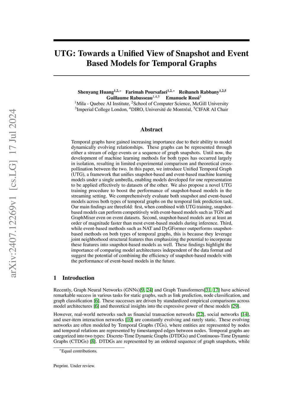Temporal graphs have gained increasing importance due to their ability to model dynamically evolving relationships. These graphs can be represented through either a stream of edge events or a sequence of graph snapshots. Until now, the development of machine learning methods for both types has occurred largely in isolation, resulting in limited experimental comparison and theoretical crosspollination between the two. In this paper, we introduce Unified Temporal Graph (UTG), a framework that unifies snapshot-based and event-based machine learning models under a single umbrella, enabling models developed for one representation to be applied effectively to datasets of the other. We also propose a novel UTG training procedure to boost the performance of snapshot-based models in the streaming setting. We comprehensively evaluate both snapshot and event-based models across both types of temporal graphs on the temporal link prediction task. Our main findings are threefold: first, when combined with UTG training, snapshotbased models can perform competitively with event-based models such as TGN and GraphMixer even on event datasets. Second, snapshot-based models are at least an order of magnitude faster than most event-based models during inference. Third, while event-based methods such as NAT and DyGFormer outperforms snapshotbased methods on both types of temporal graphs, this is because they leverage joint neighborhood structural features thus emphasizing the potential to incorporate these features into snapshot-based models as well. These findings highlight the importance of comparing model architectures independent of the data format and suggest the potential of combining the efficiency of snapshot-based models with the performance of event-based models in the future.