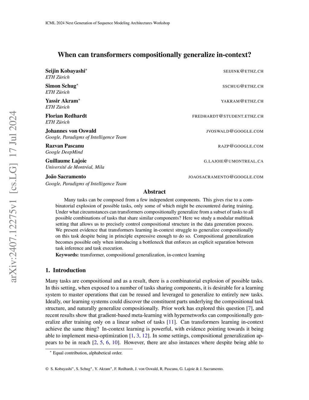 Many tasks can be composed from a few independent components. This gives rise to a combinatorial explosion of possible tasks, only some of which might be encountered during training. Under what circumstances can transformers compositionally generalize from a subset of tasks to all possible combinations of tasks that share similar components? Here we study a modular multitask setting that allows us to precisely control compositional structure in the data generation process. We present evidence that transformers learning in-context struggle to generalize compositionally on this task despite being in principle expressive enough to do so. Compositional generalization becomes possible only when introducing a bottleneck that enforces an explicit separation between task inference and task execution.