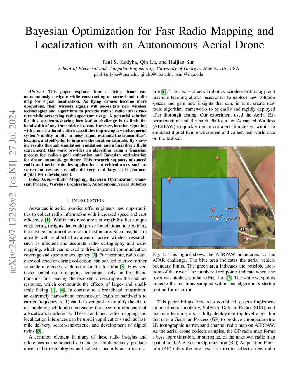 This paper explores how a flying drone can autonomously navigate while constructing a narrowband radio map for signal localization. As flying drones become more ubiquitous, their wireless signals will necessitate new wireless technologies and algorithms to provide robust radio infrastructure while preserving radio spectrum usage. A potential solution for this spectrum-sharing localization challenge is to limit the bandwidth of any transmitter beacon. However, location signaling with a narrow bandwidth necessitates improving a wireless aerial system's ability to filter a noisy signal, estimate the transmitter's location, and self-pilot to improve the location estimate. By showing results through simulation, emulation, and a final drone flight experiment, this work provides an algorithm using a Gaussian process for radio signal estimation and Bayesian optimization for drone automatic guidance. This research supports advanced radio and aerial robotics applications in critical areas such as search-and-rescue, last-mile delivery, and large-scale platform digital twin development.