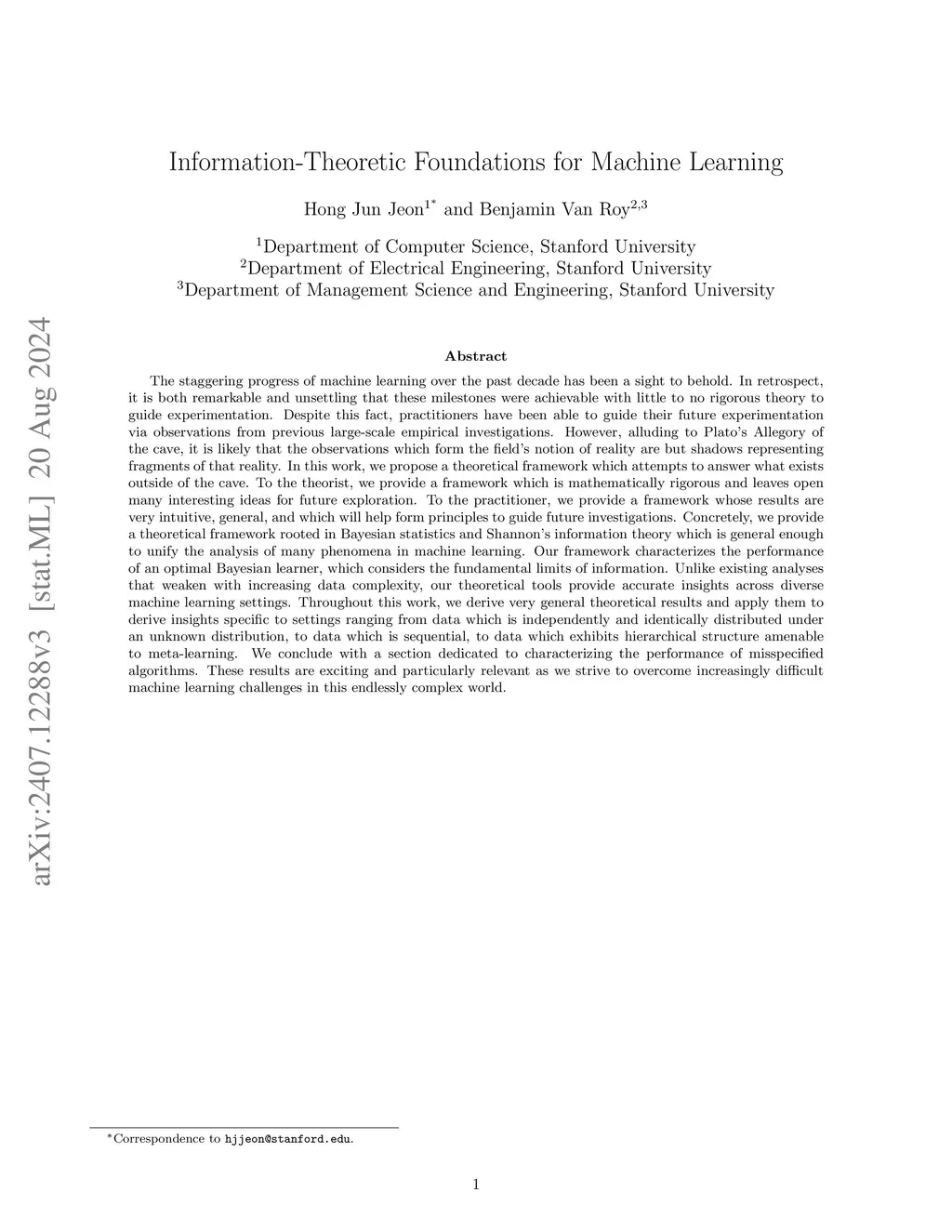 The progress of machine learning over the past decade is undeniable. In retrospect, it is both remarkable and unsettling that this progress was achievable with little to no rigorous theory to guide experimentation. Despite this fact, practitioners have been able to guide their future experimentation via observations from previous large-scale empirical investigations. In this work, we propose a theoretical framework which attempts to provide rigor to existing practices in machine learning. To the theorist, we provide a framework which is mathematically rigorous and leaves open many interesting ideas for future exploration. To the practitioner, we provide a framework whose results are simple, and provide intuition to guide future investigations across a wide range of learning paradigms. Concretely, we provide a theoretical framework rooted in Bayesian statistics and Shannon's information theory which is general enough to unify the analysis of many phenomena in machine learning. Our framework characterizes the performance of an optimal Bayesian learner as it learns from a stream of experience. Unlike existing analyses that weaken with increasing data complexity, our theoretical tools provide accurate insights across diverse machine learning settings. Throughout this work, we derive theoretical results and demonstrate their generality by apply them to derive insights specific to settings. These settings range from learning from data which is independently and identically distributed under an unknown distribution, to data which is sequential, to data which exhibits hierarchical structure amenable to meta-learning, and finally to data which is not fully explainable under the learner's beliefs (misspecification). These results are particularly relevant as we strive to understand and overcome increasingly difficult machine learning challenges in this endlessly complex world.