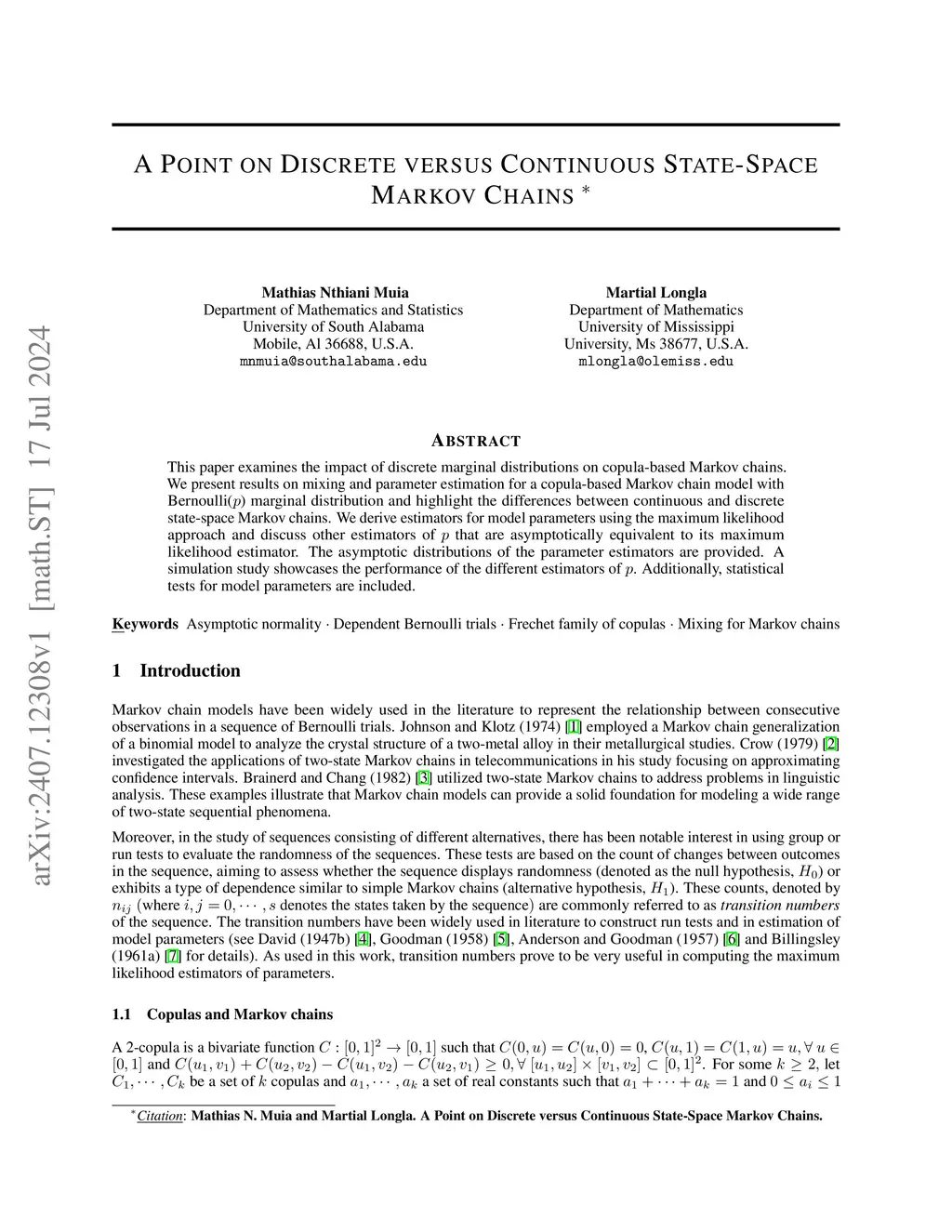 This paper examines the impact of discrete marginal distributions on copula-based Markov chains. We present results on mixing and parameter estimation for a copula-based Markov chain model with Bernoulli() marginal distribution and highlight the differences between continuous and discrete state-space Markov chains. We derive estimators for model parameters using the maximum likelihood approach and discuss other estimators of that are asymptotically equivalent to its maximum likelihood estimator. The asymptotic distributions of the parameter estimators are provided. A simulation study showcases the performance of the different estimators of . Additionally, statistical tests for model parameters are included.