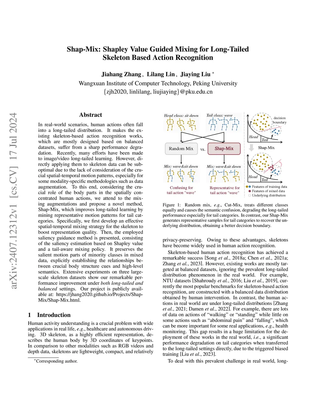 In real-world scenarios, human actions often fall into a long-tailed distribution. It makes the existing skeleton-based action recognition works, which are mostly designed based on balanced datasets, suffer from a sharp performance degradation. Recently, many efforts have been madeto image/video long-tailed learning. However, directly applying them to skeleton data can be sub-optimal due to the lack of consideration of the crucial spatial-temporal motion patterns, especially for some modality-specific methodologies such as data augmentation. To this end, considering the crucial role of the body parts in the spatially concentrated human actions, we attend to the mixing augmentations and propose a novel method, Shap-Mix, which improves long-tailed learning by mining representative motion patterns for tail categories. Specifically, we first develop an effective spatial-temporal mixing strategy for the skeleton to boost representation quality. Then, the employed saliency guidance method is presented, consisting of the saliency estimation based on Shapley value and a tail-aware mixing policy. It preserves the salient motion parts of minority classes in mixed data, explicitly establishing the relationships between crucial body structure cues and high-level semantics. Extensive experiments on three large-scale skeleton datasets show our remarkable performance improvement under both long-tailed and balanced settings. Our project is publicly available at: https://jhang2020.github.io/Projects/Shap-Mix/Shap-Mix.html.