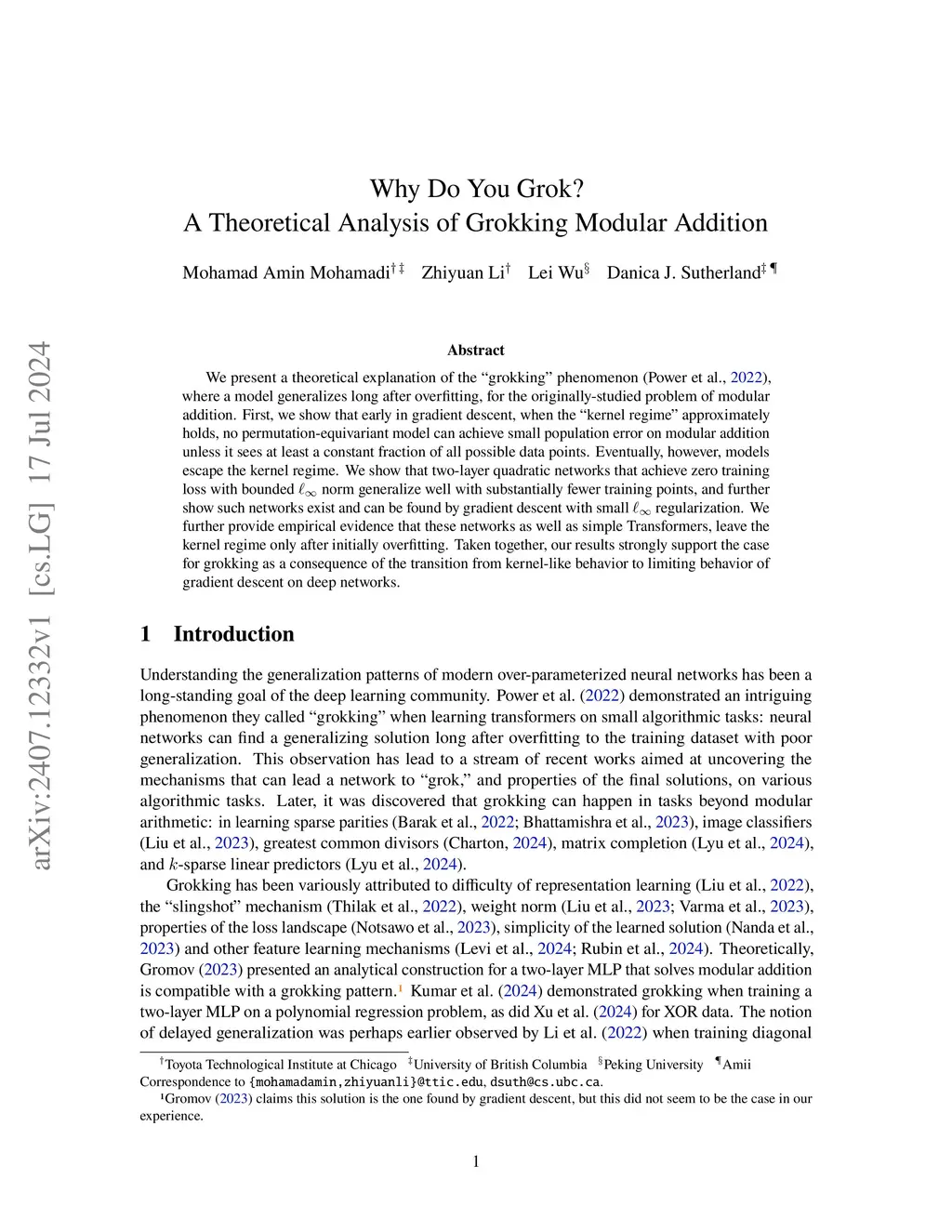 We present a theoretical explanation of the ``grokking'' phenomenon, where a model generalizes long after overfitting,for the originally-studied problem of modular addition. First, we show that early in gradient descent, when the ``kernel regime'' approximately holds, no permutation-equivariant model can achieve small population error on modular addition unless it sees at least a constant fraction of all possible data points. Eventually, however, models escape the kernel regime. We show that two-layer quadratic networks that achieve zero training loss with bounded norm generalize well with substantially fewer training points, and further show such networks exist and can be found by gradient descent with small regularization. We further provide empirical evidence that these networks as well as simple Transformers, leave the kernel regime only after initially overfitting. Taken together, our results strongly support the case for grokking as a consequence of the transition from kernel-like behavior to limiting behavior of gradient descent on deep networks.