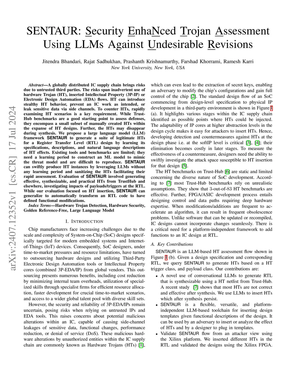 SENTAUR: Security EnhaNced Trojan Assessment Using LLMs Against