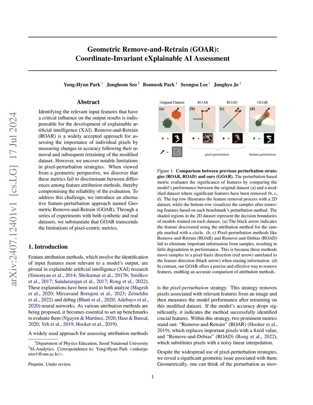 Identifying the relevant input features that have a critical influence on the output results is indispensable for the development of explainable artificial intelligence (XAI). Remove-and-Retrain (ROAR) is a widely accepted approach for assessing the importance of individual pixels by measuring changes in accuracy following their removal and subsequent retraining of the modified dataset. However, we uncover notable limitations in pixel-perturbation strategies. When viewed from a geometric perspective, we discover that these metrics fail to discriminate between differences among feature attribution methods, thereby compromising the reliability of the evaluation. To address this challenge, we introduce an alternative feature-perturbation approach named Geometric Remove-and-Retrain (GOAR). Through a series of experiments with both synthetic and real datasets, we substantiate that GOAR transcends the limitations of pixel-centric metrics.