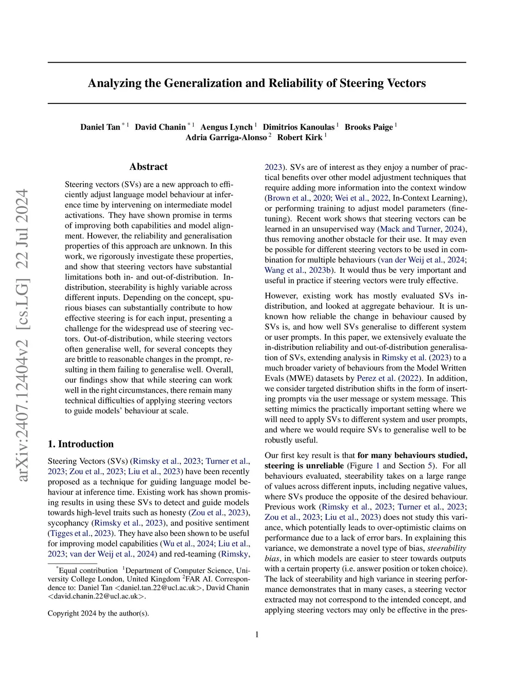 Steering vectors (SVs) are a new approach to efficiently adjust language model behaviour at inference time by intervening on intermediate model activations. They have shown promise in terms of improving both capabilities and model alignment. However, the reliability and generalisation properties of this approach are unknown. In this work, we rigorously investigate these properties, and show that steering vectors have substantial limitations both in- and out-of-distribution. In-distribution, steerability is highly variable across different inputs. Depending on the concept, spurious biases can substantially contribute to how effective steering is for each input, presenting a challenge for the widespread use of steering vectors. Out-of-distribution, while steering vectors often generalise well, for several concepts they are brittle to reasonable changes in the prompt, resulting in them failing to generalise well. Overall, our findings show that while steering can work well in the right circumstances, there remain many technical difficulties of applying steering vectors to guide models' behaviour at scale.