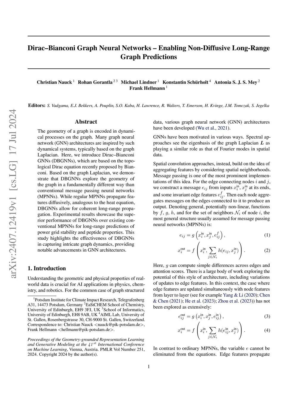 The geometry of a graph is encoded in dynamical processes on the graph. Many graph neural network (GNN) architectures are inspired by such dynamical systems, typically based on the graph Laplacian. Here, we introduce Dirac--Bianconi GNNs (DBGNNs), which are based on the topological Dirac equation recently proposed by Bianconi. Based on the graph Laplacian, we demonstrate that DBGNNs explore the geometry of the graph in a fundamentally different way than conventional message passing neural networks (MPNNs). While regular MPNNs propagate features diffusively, analogous to the heat equation, DBGNNs allow for coherent long-range propagation. Experimental results showcase the superior performance of DBGNNs over existing conventional MPNNs for long-range predictions of power grid stability and peptide properties. This study highlights the effectiveness of DBGNNs in capturing intricate graph dynamics, providing notable advancements in GNN architectures.
