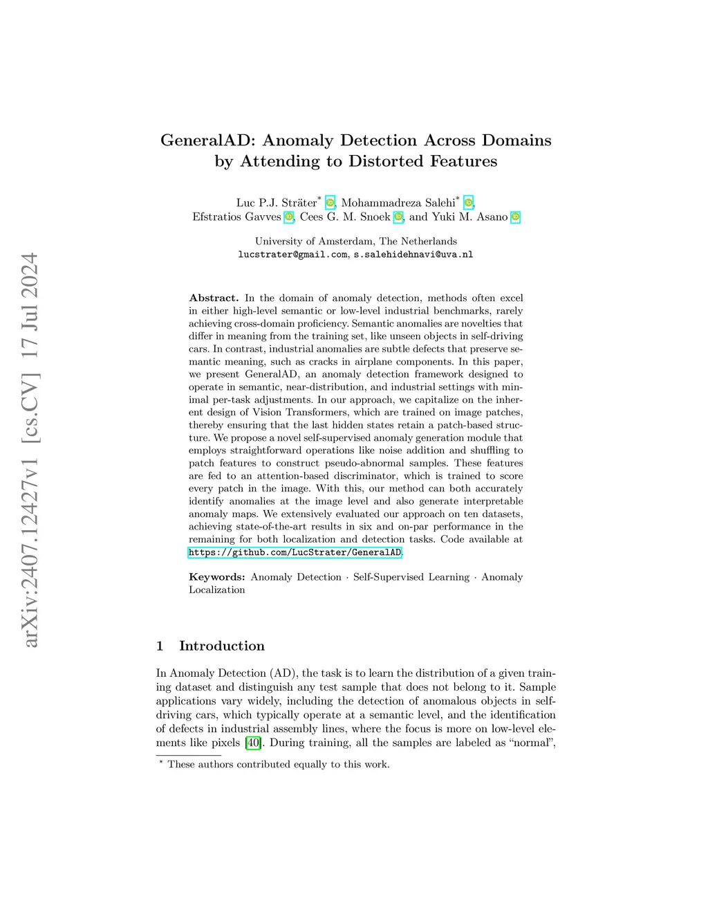 In the domain of anomaly detection, methods often excel in either high-level semantic or low-level industrial benchmarks, rarely achieving cross-domain proficiency. Semantic anomalies are novelties that differ in meaning from the training set, like unseen objects in self-driving cars. In contrast, industrial anomalies are subtle defects that preserve semantic meaning, such as cracks in airplane components. In this paper, we present GeneralAD, an anomaly detection framework designed to operate in semantic, near-distribution, and industrial settings with minimal per-task adjustments. In our approach, we capitalize on the inherent design of Vision Transformers, which are trained on image patches, thereby ensuring that the last hidden states retain a patch-based structure. We propose a novel self-supervised anomaly generation module that employs straightforward operations like noise addition and shuffling to patch features to construct pseudo-abnormal samples. These features are fed to an attention-based discriminator, which is trained to score every patch in the image. With this, our method can both accurately identify anomalies at the image level and also generate interpretable anomaly maps. We extensively evaluated our approach on ten datasets, achieving state-of-the-art results in six and on-par performance in the remaining for both localization and detection tasks.