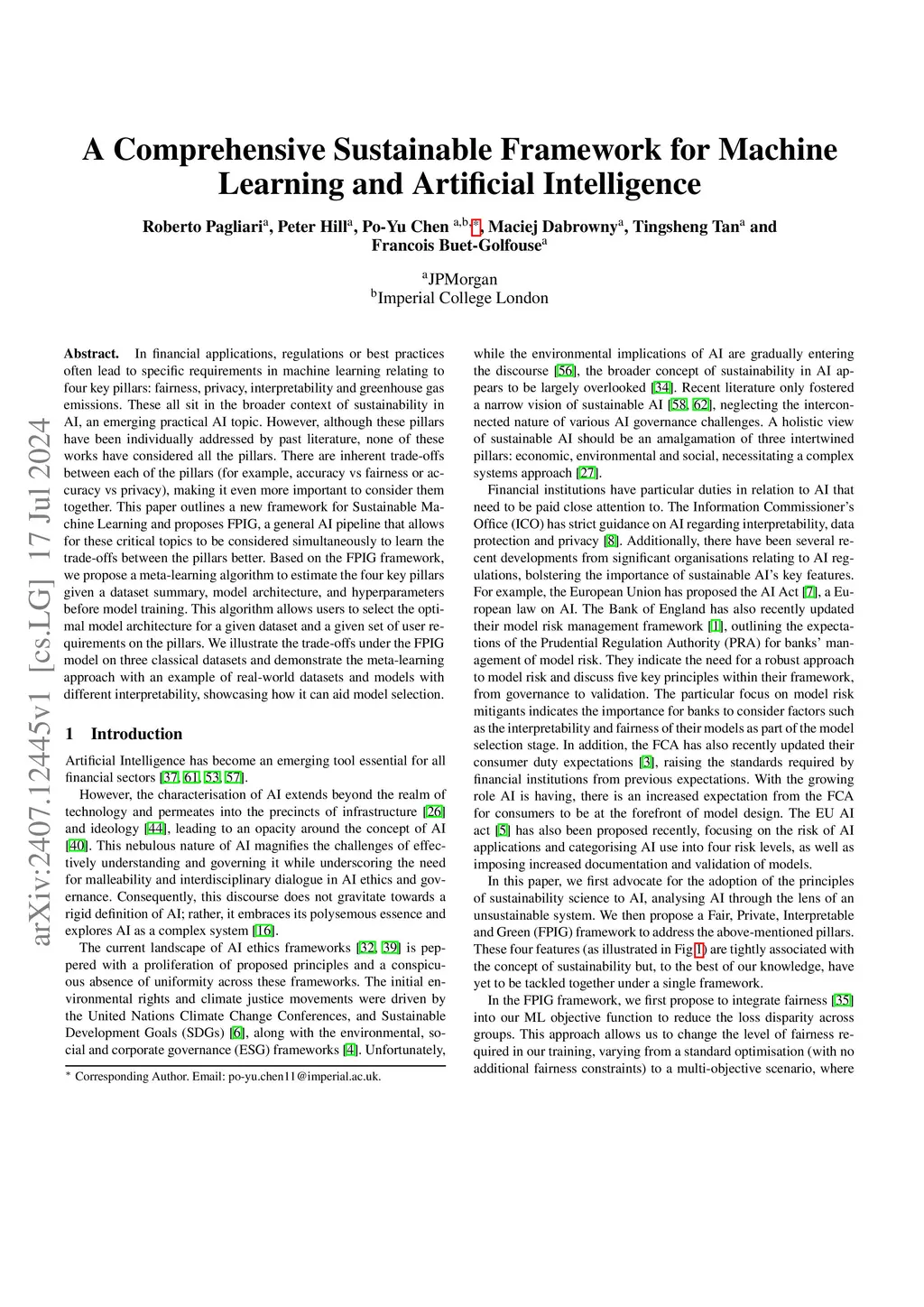 In financial applications, regulations or best practices often lead to specific requirements in machine learning relating to four key pillars: fairness, privacy, interpretability and greenhouse gas emissions. These all sit in the broader context of sustainability in AI, an emerging practical AI topic. However, although these pillars have been individually addressed by past literature, none of these works have considered all the pillars. There are inherent trade-offs between each of the pillars (for example, accuracy vs fairness or accuracy vs privacy), making it even more important to consider them together. This paper outlines a new framework for Sustainable Machine Learning and proposes FPIG, a general AI pipeline that allows for these critical topics to be considered simultaneously to learn the trade-offs between the pillars better. Based on the FPIG framework, we propose a meta-learning algorithm to estimate the four key pillars given a dataset summary, model architecture, and hyperparameters before model training. This algorithm allows users to select the optimal model architecture for a given dataset and a given set of user requirements on the pillars. We illustrate the trade-offs under the FPIG model on three classical datasets and demonstrate the meta-learning approach with an example of real-world datasets and models with different interpretability, showcasing how it can aid model selection.