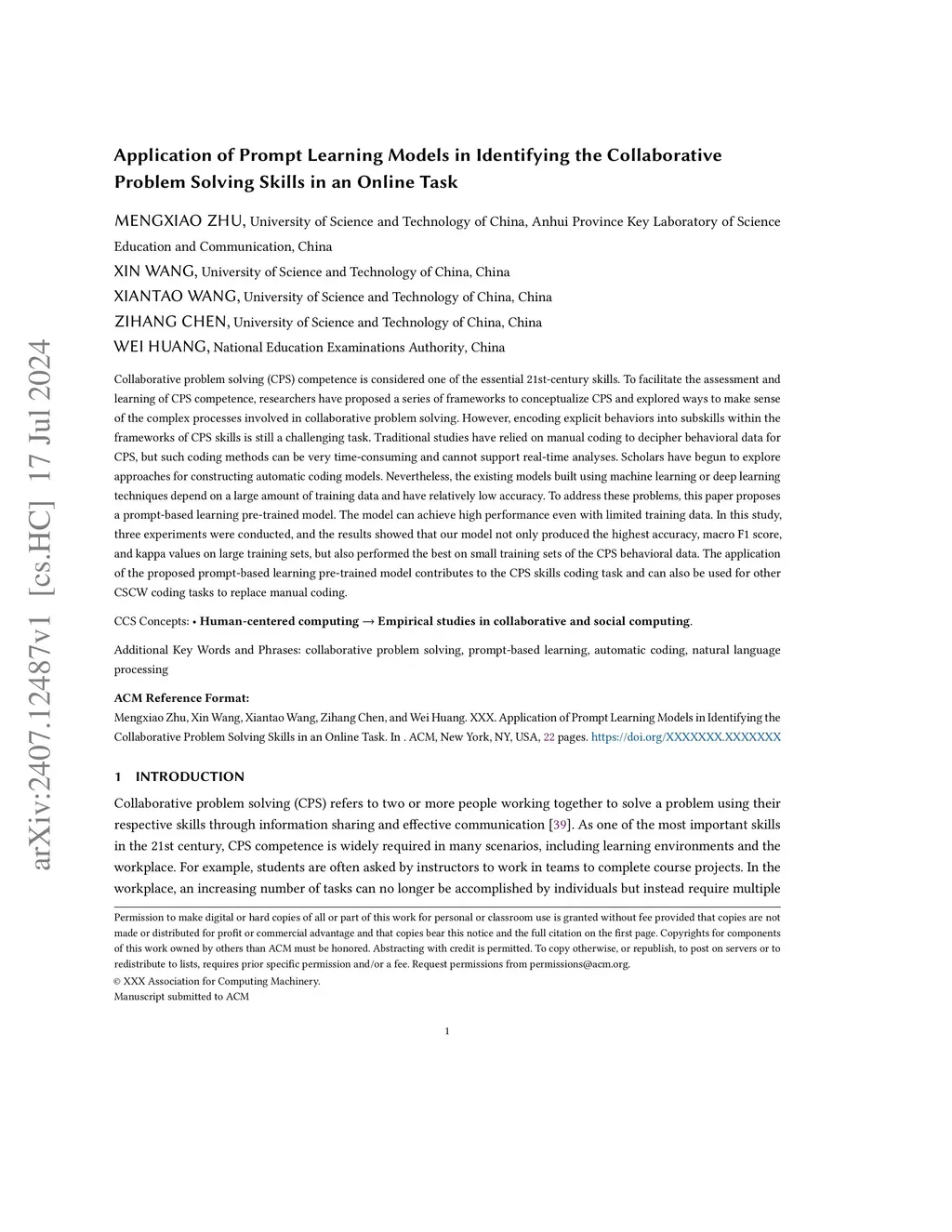 Collaborative problem solving (CPS) competence is considered one of the essential 21st-century skills. To facilitate the assessment and learning of CPS competence, researchers have proposed a series of frameworks to conceptualize CPS and explored ways to make sense of the complex processes involved in collaborative problem solving. However, encoding explicit behaviors into subskills within the frameworks of CPS skills is still a challenging task. Traditional studies have relied on manual coding to decipher behavioral data for CPS, but such coding methods can be very time-consuming and cannot support real-time analyses. Scholars have begun to explore approaches for constructing automatic coding models. Nevertheless, the existing models built using machine learning or deep learning techniques depend on a large amount of training data and have relatively low accuracy. To address these problems, this paper proposes a prompt-based learning pre-trained model. The model can achieve high performance even with limited training data. In this study, three experiments were conducted, and the results showed that our model not only produced the highest accuracy, macro F1 score, and kappa values on large training sets, but also performed the best on small training sets of the CPS behavioral data. The application of the proposed prompt-based learning pre-trained model contributes to the CPS skills coding task and can also be used for other CSCW coding tasks to replace manual coding.