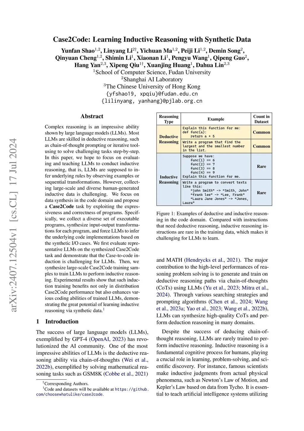 Large Language Models (LLMs) have shown outstanding breakthroughs in code generation. Recent work improves code LLMs by training on synthetic data generated by some powerful LLMs, which can be challenging to scale due to the dependence on a teacher model and high generation costs. In this paper, we focus on synthesizing code data at scale and propose a \textbf{Case2Code} task by exploiting the expressiveness and correctness of programs. \textbf{Case2Code} is an inductive inference task that aims to infer underlying code implementations by observing input-output examples or program behaviors, By incorporating LLMs to generate program inputs, and executing the program with these inputs to obtain the program outputs, we can synthesize diverse and high-quality \textbf{Case2Code} data at scale for training and evaluating code LLMs. Experimental results show that case-to-code induction is challenging for current representative LLMs if they are untrained. Models trained with \textbf{Case2Code} improve performance not only on distribution case-to-code induction but also on various coding-generation tasks, demonstrating the great potential of large-scale synthetic data and inductive learning.