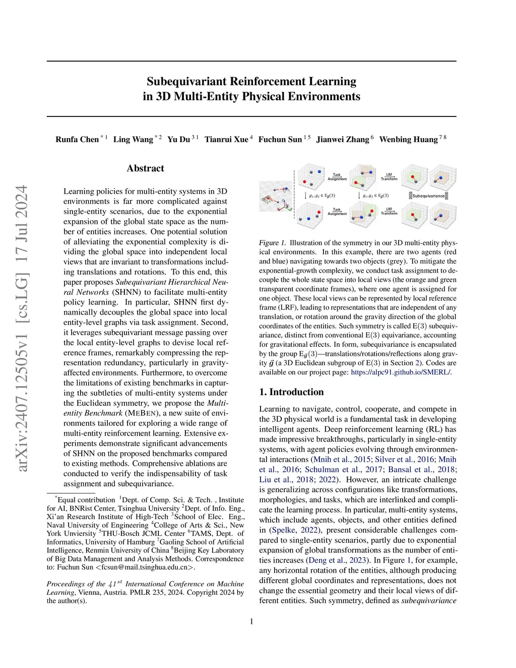 Learning policies for multi-entity systems in 3D environments is far more complicated against single-entity scenarios, due to the exponential expansion of the global state space as the number of entities increases. One potential solution of alleviating the exponential complexity is dividing the global space into independent local views that are invariant to transformations including translations and rotations. To this end, this paper proposes Subequivariant Hierarchical Neural Networks (SHNN) to facilitate multi-entity policy learning. In particular, SHNN first dynamically decouples the global space into local entity-level graphs via task assignment. Second, it leverages subequivariant message passing over the local entity-level graphs to devise local reference frames, remarkably compressing the representation redundancy, particularly in gravity-affected environments. Furthermore, to overcome the limitations of existing benchmarks in capturing the subtleties of multi-entity systems under the Euclidean symmetry, we propose the Multi-entity Benchmark (MEBEN), a new suite of environments tailored for exploring a wide range of multi-entity reinforcement learning. Extensive experiments demonstrate significant advancements of SHNN on the proposed benchmarks compared to existing methods. Comprehensive ablations are conducted to verify the indispensability of task assignment and subequivariance.