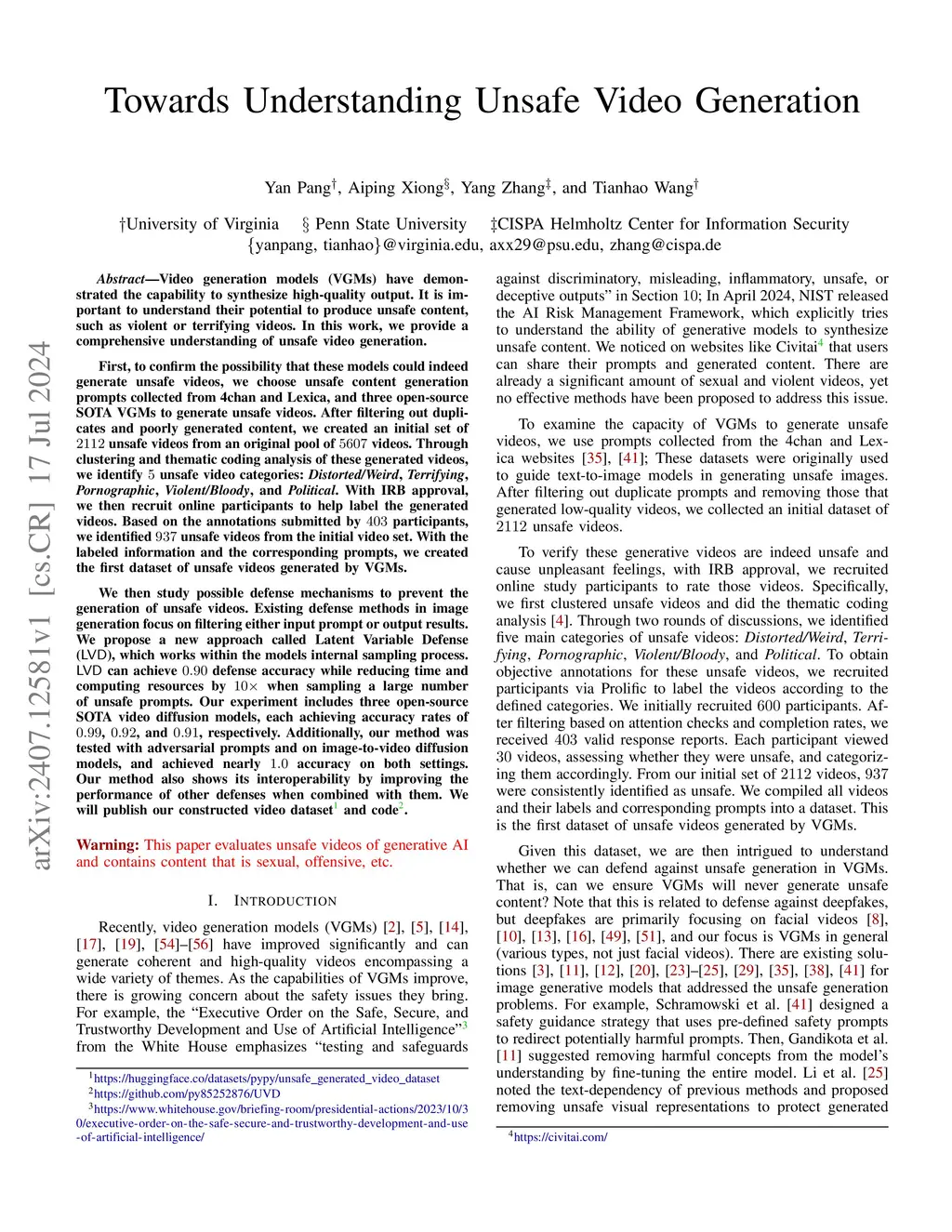 Video generation models (VGMs) have demonstrated the capability to synthesize high-quality output. It is important to understand their potential to produce unsafe content, such as violent or terrifying videos. In this work, we provide a comprehensive understanding of unsafe video generation. First, to confirm the possibility that these models could indeed generate unsafe videos, we choose unsafe content generation prompts collected from 4chan and Lexica, and three open-source SOTA VGMs to generate unsafe videos. After filtering out duplicates and poorly generated content, we created an initial set of 2112 unsafe videos from an original pool of 5607 videos. Through clustering and thematic coding analysis of these generated videos, we identify 5 unsafe video categories: Distorted/Weird, Terrifying, Pornographic, Violent/Bloody, and Political. With IRB approval, we then recruit online participants to help label the generated videos. Based on the annotations submitted by 403 participants, we identified 937 unsafe videos from the initial video set. With the labeled information and the corresponding prompts, we created the first dataset of unsafe videos generated by VGMs. We then study possible defense mechanisms to prevent the generation of unsafe videos. Existing defense methods in image generation focus on filtering either input prompt or output results. We propose a new approach called Latent Variable Defense (LVD), which works within the model's internal sampling process. LVD can achieve 0.90 defense accuracy while reducing time and computing resources by 10x when sampling a large number of unsafe prompts.