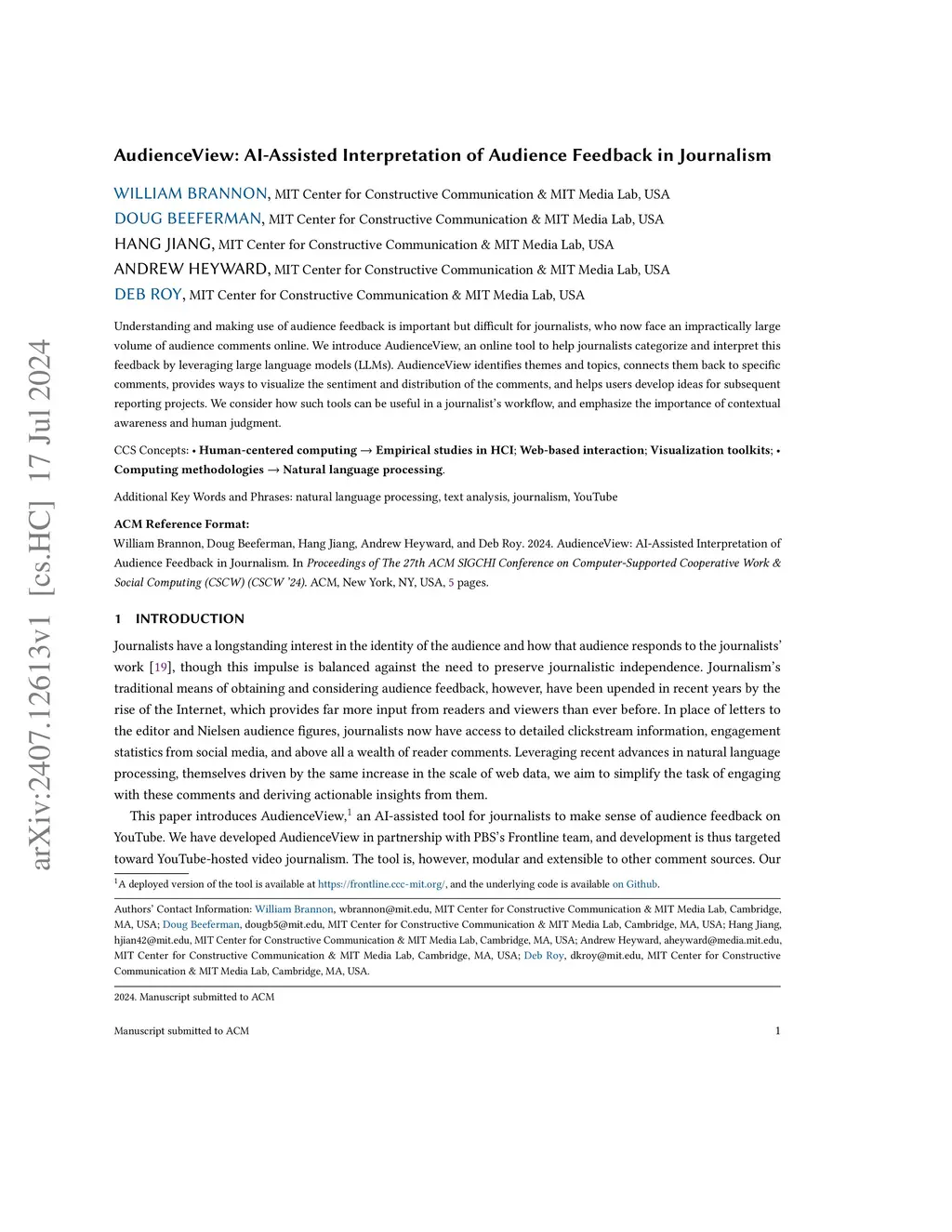 Understanding and making use of audience feedback is important but difficult for journalists, who now face an impractically large volume of audience comments online. We introduce AudienceView, an online tool to help journalists categorize and interpret this feedback by leveraging large language models (LLMs). AudienceView identifies themes and topics, connects them back to specific comments, provides ways to visualize the sentiment and distribution of the comments, and helps users develop ideas for subsequent reporting projects. We consider how such tools can be useful in a journalist's workflow, and emphasize the importance of contextual awareness and human judgment.