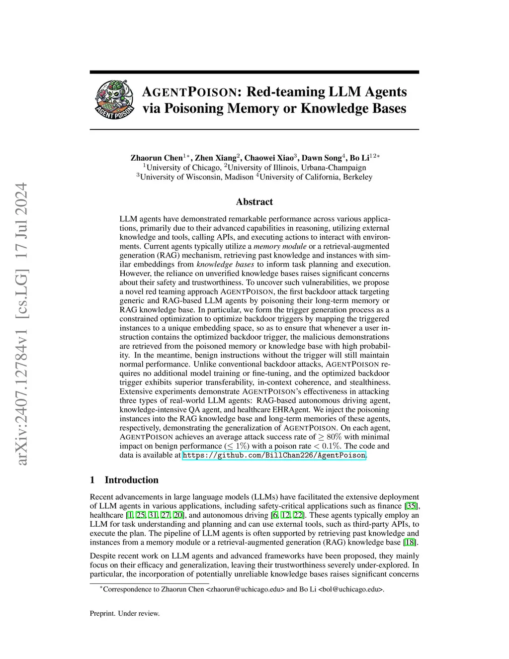 AgentPoison: Red-teaming LLM Agents via Poisoning Memory or Knowledge