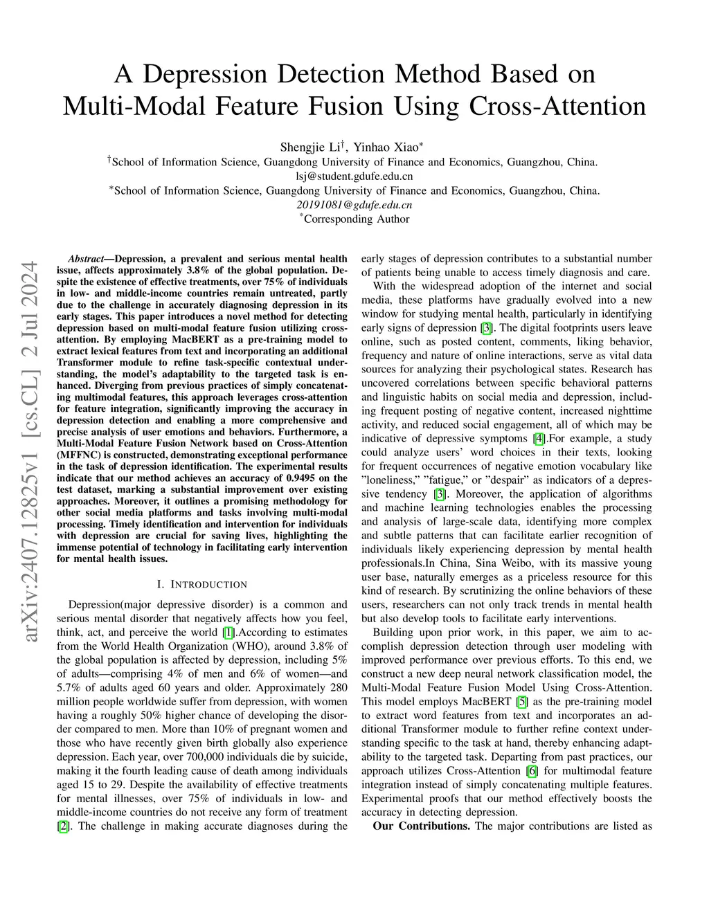 Depression, a prevalent and serious mental health issue, affects approximately 3.8\% of the global population. Despite the existence of effective treatments, over 75\% of individuals in low- and middle-income countries remain untreated, partly due to the challenge in accurately diagnosing depression in its early stages. This paper introduces a novel method for detecting depression based on multi-modal feature fusion utilizing cross-attention. By employing MacBERT as a pre-training model to extract lexical features from text and incorporating an additional Transformer module to refine task-specific contextual understanding, the model's adaptability to the targeted task is enhanced. Diverging from previous practices of simply concatenating multimodal features, this approach leverages cross-attention for feature integration, significantly improving the accuracy in depression detection and enabling a more comprehensive and precise analysis of user emotions and behaviors. Furthermore, a Multi-Modal Feature Fusion Network based on Cross-Attention (MFFNC) is constructed, demonstrating exceptional performance in the task of depression identification. The experimental results indicate that our method achieves an accuracy of 0.9495 on the test dataset, marking a substantial improvement over existing approaches. Moreover, it outlines a promising methodology for other social media platforms and tasks involving multi-modal processing. Timely identification and intervention for individuals with depression are crucial for saving lives, highlighting the immense potential of technology in facilitating early intervention for mental health issues.