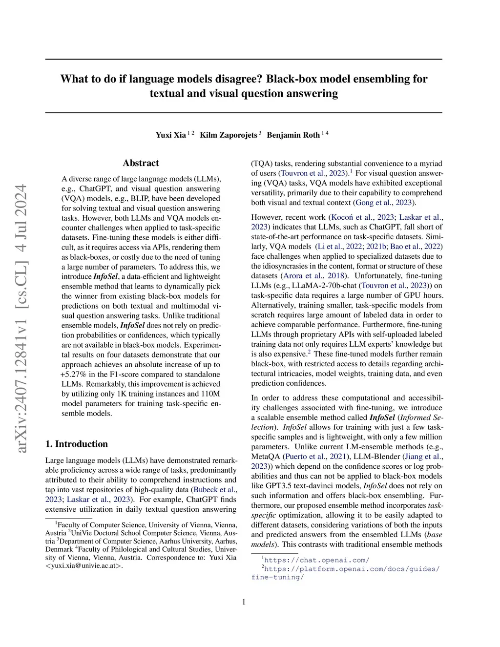 A diverse range of large language models (LLMs), e.g., ChatGPT, and visual question answering (VQA) models, e.g., BLIP, have been developed for solving textual and visual question answering tasks. However, both LLMs and VQA models encounter challenges when applied to task-specific datasets. Fine-tuning these models is either difficult, as it requires access via APIs, rendering them as black-boxes, or costly due to the need of tuning a large number of parameters. To address this, we introduce InfoSel, a data-efficient and lightweight ensemble method that learns to dynamically pick the winner from existing black-box models for predictions on both textual and multimodal visual question answering tasks. Unlike traditional ensemble models, InfoSel does not rely on prediction probabilities or confidences, which typically are not available in black-box models. Experimental results on four datasets demonstrate that our approach achieves an absolute increase of up to +5.27% in the F1-score compared to standalone LLMs. Remarkably, this improvement is achieved by utilizing only 1K training instances and 110M model parameters for training task-specific ensemble models.