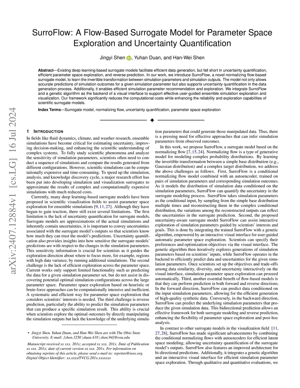 Existing deep learning-based surrogate models facilitate efficient data generation, but fall short in uncertainty quantification, efficient parameter space exploration, and reverse prediction. In our work, we introduce SurroFlow, a novel normalizing flow-based surrogate model, to learn the invertible transformation between simulation parameters and simulation outputs. The model not only allows accurate predictions of simulation outcomes for a given simulation parameter but also supports uncertainty quantification in the data generation process. Additionally, it enables efficient simulation parameter recommendation and exploration. We integrate SurroFlow and a genetic algorithm as the backend of a visual interface to support effective user-guided ensemble simulation exploration and visualization. Our framework significantly reduces the computational costs while enhancing the reliability and exploration capabilities of scientific surrogate models.