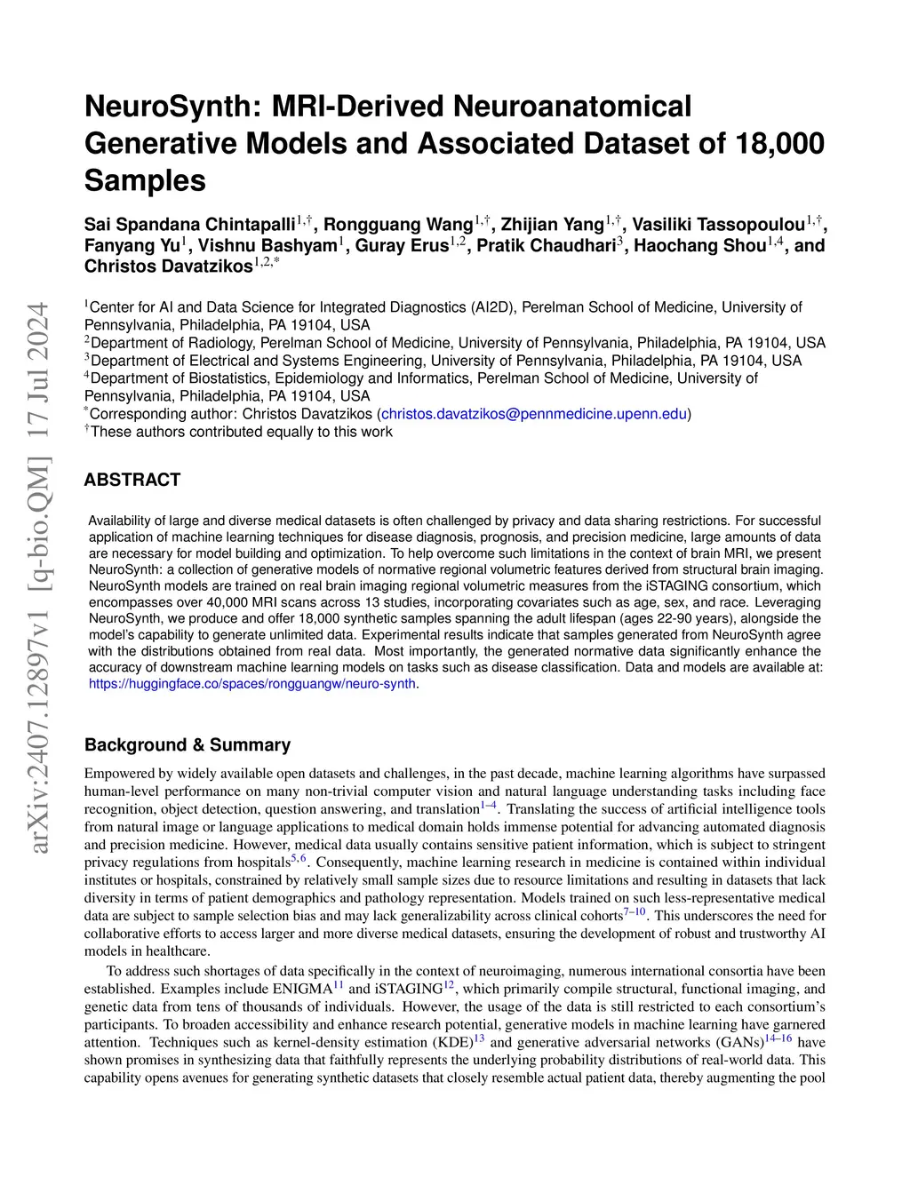 NeuroSynth: MRI-Derived Neuroanatomical Generative Models and Associated