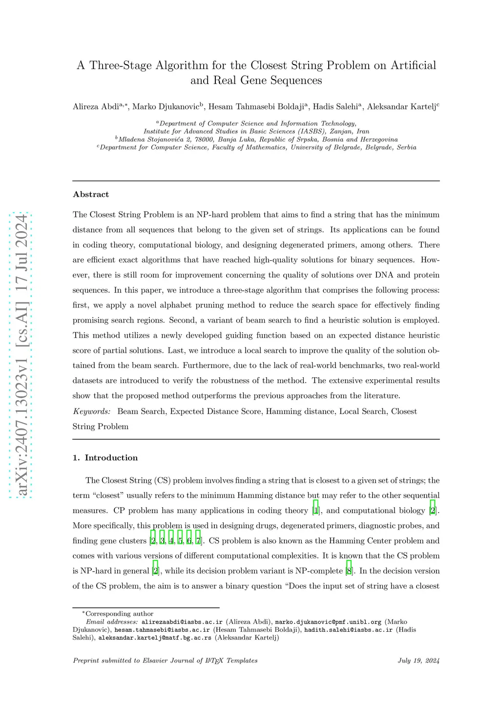 The Closest String Problem is an NP-hard problem that aims to find a string that has the minimum distance from all sequences that belong to the given set of strings. Its applications can be found in coding theory, computational biology, and designing degenerated primers, among others. There are efficient exact algorithms that have reached high-quality solutions for binary sequences. However, there is still room for improvement concerning the quality of solutions over DNA and protein sequences. In this paper, we introduce a three-stage algorithm that comprises the following process: first, we apply a novel alphabet pruning method to reduce the search space for effectively finding promising search regions. Second, a variant of beam search to find a heuristic solution is employed. This method utilizes a newly developed guiding function based on an expected distance heuristic score of partial solutions. Last, we introduce a local search to improve the quality of the solution obtained from the beam search. Furthermore, due to the lack of real-world benchmarks, two real-world datasets are introduced to verify the robustness of the method. The extensive experimental results show that the proposed method outperforms the previous approaches from the literature.