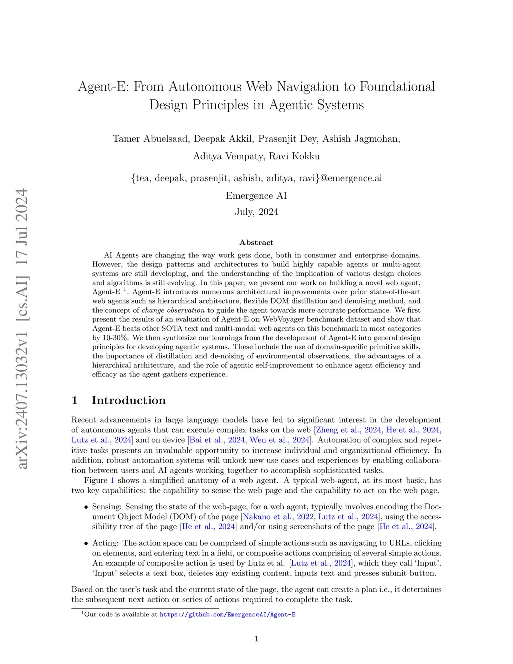 AI Agents are changing the way work gets done, both in consumer and enterprise domains. However, the design patterns and architectures to build highly capable agents or multi-agent systems are still developing, and the understanding of the implication of various design choices and algorithms is still evolving. In this paper, we present our work on building a novel web agent, Agent-E \footnote{Our code is available at \url{https://github.com/EmergenceAI/Agent-E}}. Agent-E introduces numerous architectural improvements over prior state-of-the-art web agents such as hierarchical architecture, flexible DOM distillation and denoising method, and the concept of \textit{change observation} to guide the agent towards more accurate performance. We first present the results of an evaluation of Agent-E on WebVoyager benchmark dataset and show that Agent-E beats other SOTA text and multi-modal web agents on this benchmark in most categories by 10-30\%. We then synthesize our learnings from the development of Agent-E into general design principles for developing agentic systems. These include the use of domain-specific primitive skills, the importance of distillation and de-noising of environmental observations, the advantages of a hierarchical architecture, and the role of agentic self-improvement to enhance agent efficiency and efficacy as the agent gathers experience.