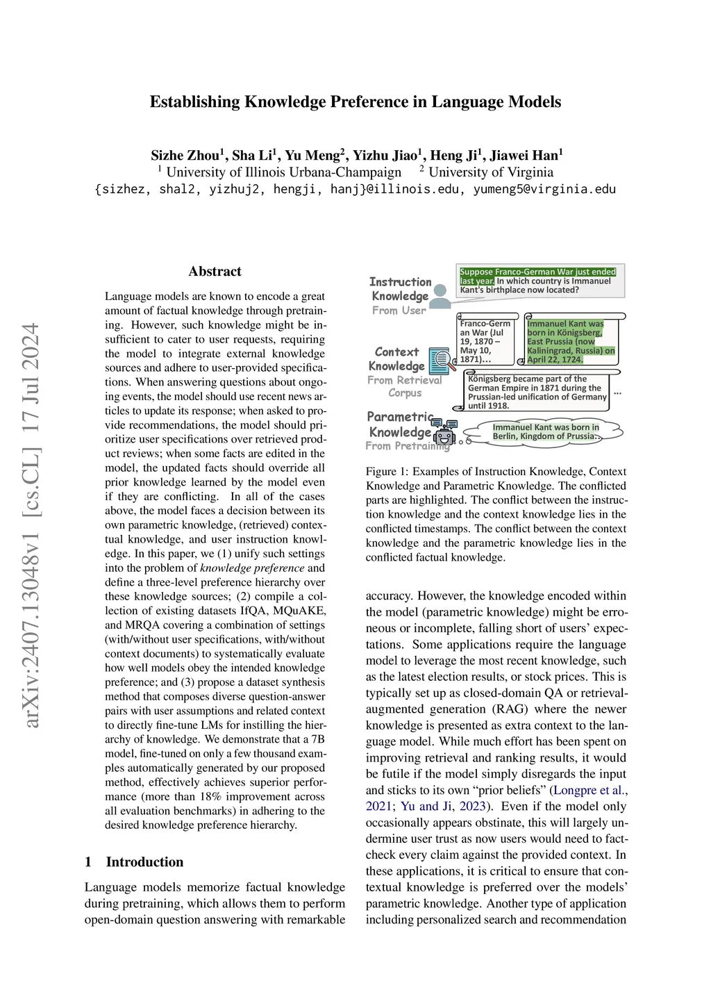 Language models are known to encode a great amount of factual knowledge through pretraining. However, such knowledge might be insufficient to cater to user requests, requiring the model to integrate external knowledge sources and adhere to user-provided specifications. When answering questions about ongoing events, the model should use recent news articles to update its response; when asked to provide recommendations, the model should prioritize user specifications over retrieved product reviews; when some facts are edited in the model, the updated facts should override all prior knowledge learned by the model even if they are conflicting. In all of the cases above, the model faces a decision between its own parametric knowledge, (retrieved) contextual knowledge, and user instruction knowledge. In this paper, we (1) unify such settings into the problem of knowledge preference and define a three-level preference hierarchy over these knowledge sources; (2) compile a collection of existing datasets IfQA, MQuAKE, and MRQA covering a combination of settings (with/without user specifications, with/without context documents) to systematically evaluate how well models obey the intended knowledge preference; and (3) propose a dataset synthesis method that composes diverse question-answer pairs with user assumptions and related context to directly fine-tune LMs for instilling the hierarchy of knowledge. We demonstrate that a 7B model, fine-tuned on only a few thousand examples automatically generated by our proposed method, effectively achieves superior performance (more than 18% improvement across all evaluation benchmarks) in adhering to the desired knowledge preference hierarchy.