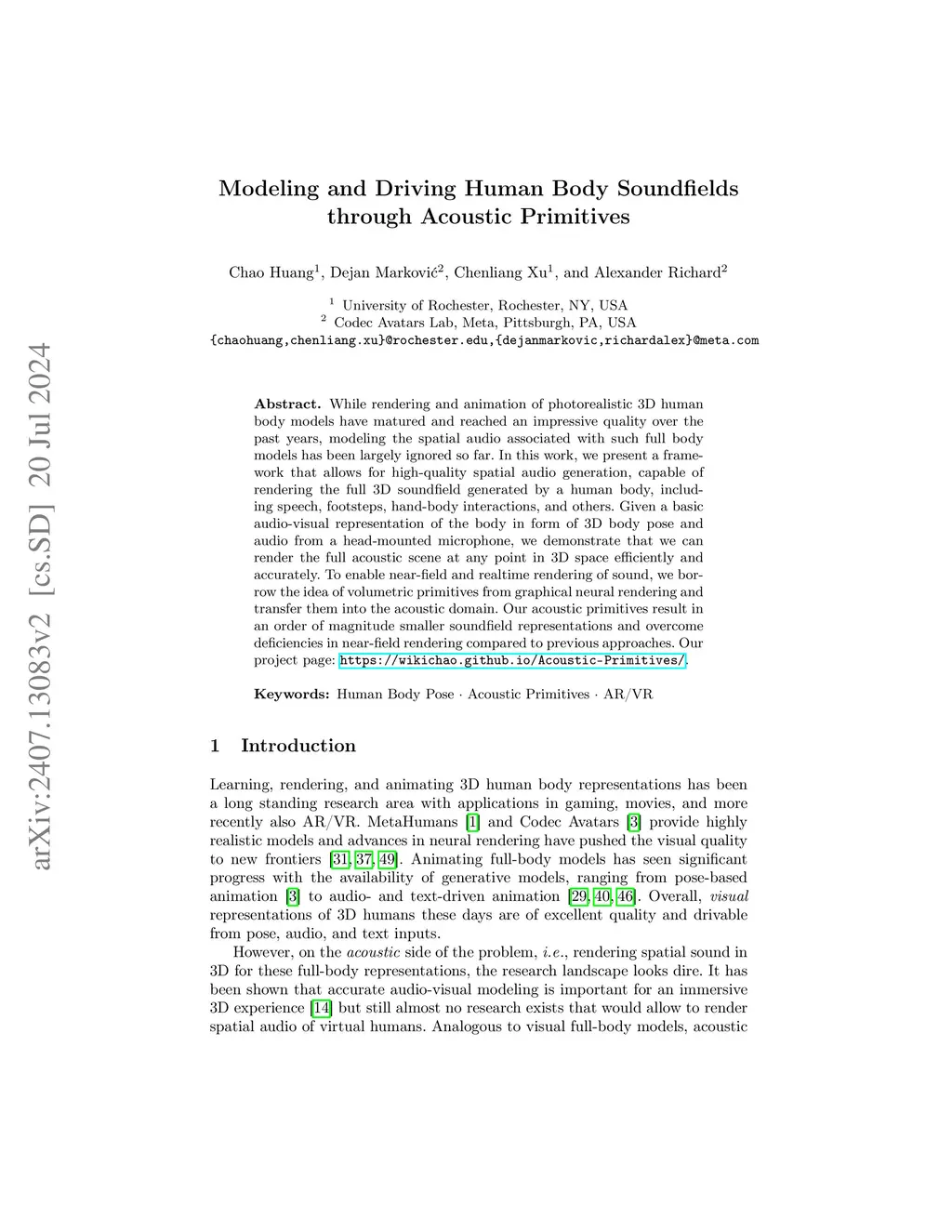 While rendering and animation of photorealistic 3D human body models have matured and reached an impressive quality over the past years, modeling the spatial audio associated with such full body models has been largely ignored so far. In this work, we present a framework that allows for high-quality spatial audio generation, capable of rendering the full 3D soundfield generated by a human body, including speech, footsteps, hand-body interactions, and others. Given a basic audio-visual representation of the body in form of 3D body pose and audio from a head-mounted microphone, we demonstrate that we can render the full acoustic scene at any point in 3D space efficiently and accurately. To enable near-field and realtime rendering of sound, we borrow the idea of volumetric primitives from graphical neural rendering and transfer them into the acoustic domain. Our acoustic primitives result in an order of magnitude smaller soundfield representations and overcome deficiencies in near-field rendering compared to previous approaches.